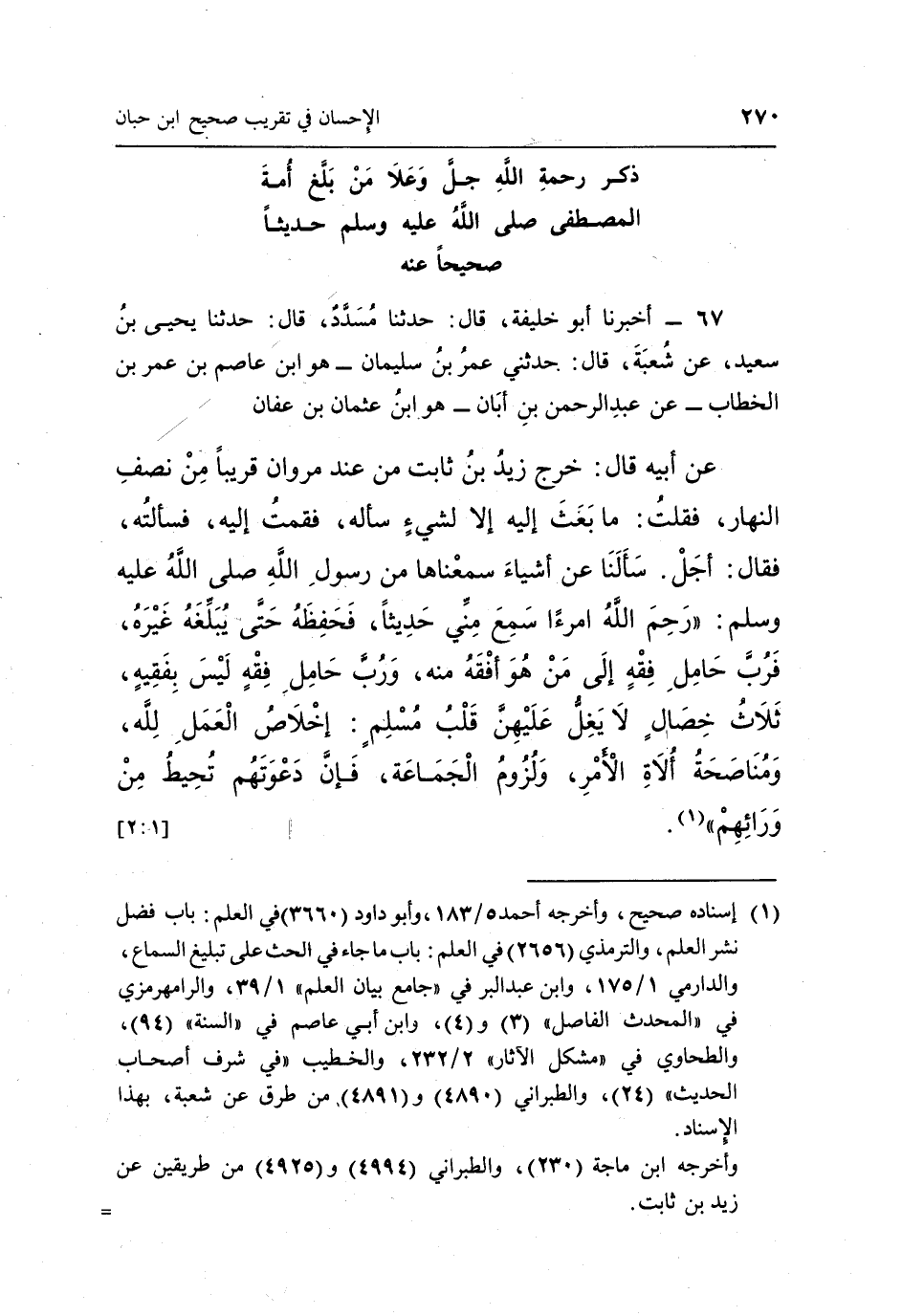 67 - أَخْبَرَنَا أَبُو خَلِيفَةَ قَالَ حَدَّثَنَا مُسَدَّدٌ قَالَ حَدَّثَنَا يَحْيَى بْنُ سَعِيدٍ عَنْ شُعْبَةَ قَالَ حَدَّثَنِي عُمَرُ بْنُ سُلَيْمَانَ هُوَ بن عَاصِمِ بْنِ عُمَرَ بْنِ الْخَطَّابِ عَنْ عَبْدِ الرحمن بن أبان هو بن عُثْمَانَ بْنِ عَفَّانَ عَنْ أَبِيهِ قَالَ خَرَجَ زَيْدُ بْنُ ثَابِتٍ مِنْ عِنْدِ مَرْوَانَ قَرِيبًا مِنْ نِصْفِ النَّهَارِ فَقُلْتُ مَا بَعَثَ إِلَيْهِ إِلَّا لِشَيْءٍ سَأَلَهُ فَقُمْتُ إِلَيْهِ فَسَأَلْتُهُ فَقَالَ أَجَلْ سَأَلَنَا عَنْ أَشْيَاءَ سَمِعْنَاهَا مِنْ رَسُولِ اللَّهِ صَلَّى اللَّهُ عَلَيْهِ وَسَلَّمَ: "رَحِمَ اللَّهُ امْرَأً سَمِعَ مِنِّي حَدِيثًا فَحَفِظَهُ حَتَّى يُبَلِّغَهُ غَيْرَهُ فَرُبَّ حَامِلِ فِقْهٍ إِلَى مَنْ هُوَ أَفْقَهُ مِنْهُ وَرُبَّ حَامِلِ فِقْهٍ لَيْسَ بِفَقِيهٍ ثَلَاثُ خِصَالٍ لَا يَغِلُّ عَلَيْهِنَّ قَلْبُ مُسْلِمٍ إِخْلَاصُ الْعَمَلِ لِلَّهِ وَمُنَاصَحَةُ أُلَاةِ الْأَمْرِ وَلُزُومُ الْجَمَاعَةِ فَإِنَّ دَعْوَتَهُمْ تُحِيطُ مِنْ ورائهم"1. [2:1]