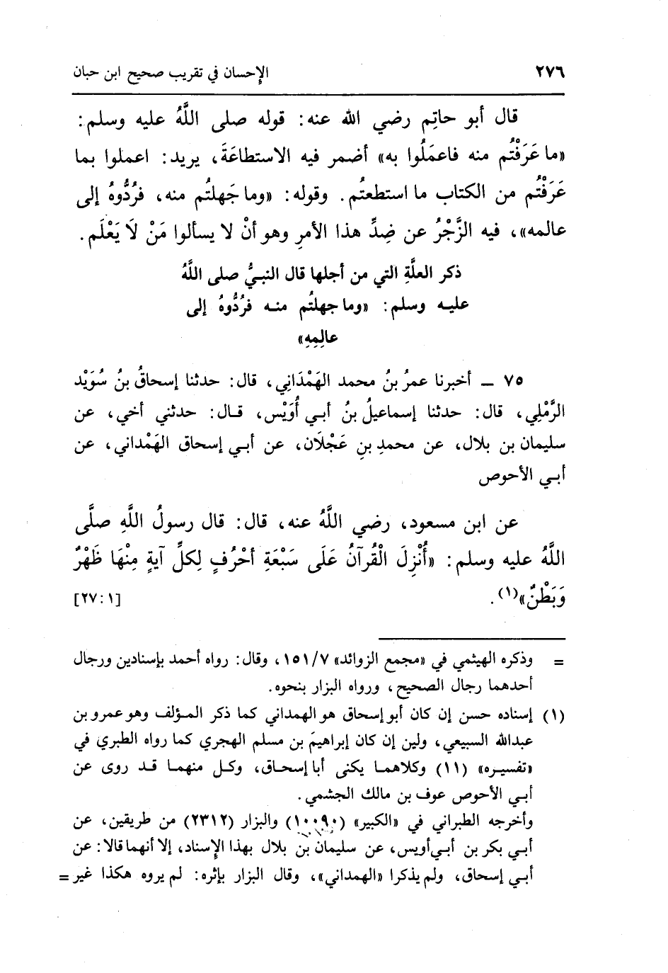 75 - أَخْبَرَنَا عُمَرُ بْنُ مُحَمَّدٍ الْهَمْدَانِيُّ قَالَ حَدَّثَنَا إِسْحَاقُ بْنُ سُوَيْدٍ الرَّمْلِيُّ قَالَ حَدَّثَنَا إِسْمَاعِيلُ بْنُ أَبِي أُوَيْسٍ قَالَ حَدَّثَنِي أَخِي عَنْ سُلَيْمَانَ بْنِ بِلَالٍ عَنْ مُحَمَّدِ بْنِ عَجْلَانَ عَنْ أَبِي إِسْحَاقَ الْهَمْدَانِيِّ عن أبي الأحوص عن بن مسعود رضي الله تعالى عَنْهُ قَالَ قَالَ رَسُولُ اللَّهِ صَلَّى اللَّهُ عَلَيْهِ وَسَلَّمَ: "أُنْزِلَ الْقُرْآنُ عَلَى سَبْعَةِ أَحْرُفٍ لكل آية منها ظهر وبطن"1. [27:1]