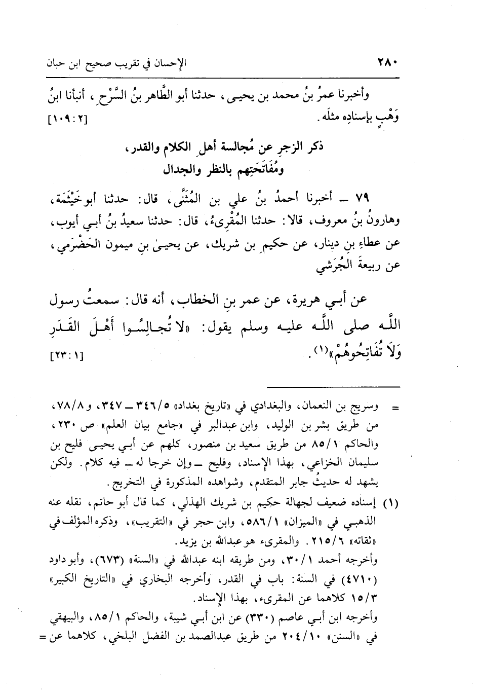 79 - أَخْبَرَنَا أَحْمَدُ بْنُ عَلِيِّ بْنِ الْمُثَنَّى قَالَ حَدَّثَنَا أَبُو خَيْثَمَةَ وَهَارُونُ بن معروف قالا حدثنا المقرىء قَالَ حَدَّثَنَا سَعِيدُ بْنُ أَبِي أَيُّوبَ عَنْ عَطَاءِ بْنِ دِينَارٍ عَنْ حَكِيمِ بْنِ شَرِيكٍ عَنْ يَحْيَى بْنِ مَيْمُونٍ الْحَضْرَمِيِّ عَنْ رَبِيعَةَ الْجُرَشِيِّ عَنْ أَبِي هُرَيْرَةَ عَنْ عُمَرَ بْنِ الحطاب أَنَّهُ قَالَ سَمِعْتُ رَسُولَ اللَّهِ صَلَّى اللَّهُ عَلَيْهِ وَسَلَّمَ يَقُولُ: "لَا تُجَالِسُوا أَهْلَ الْقَدَرِ ولا تفاتحوهم"1. [23:1]