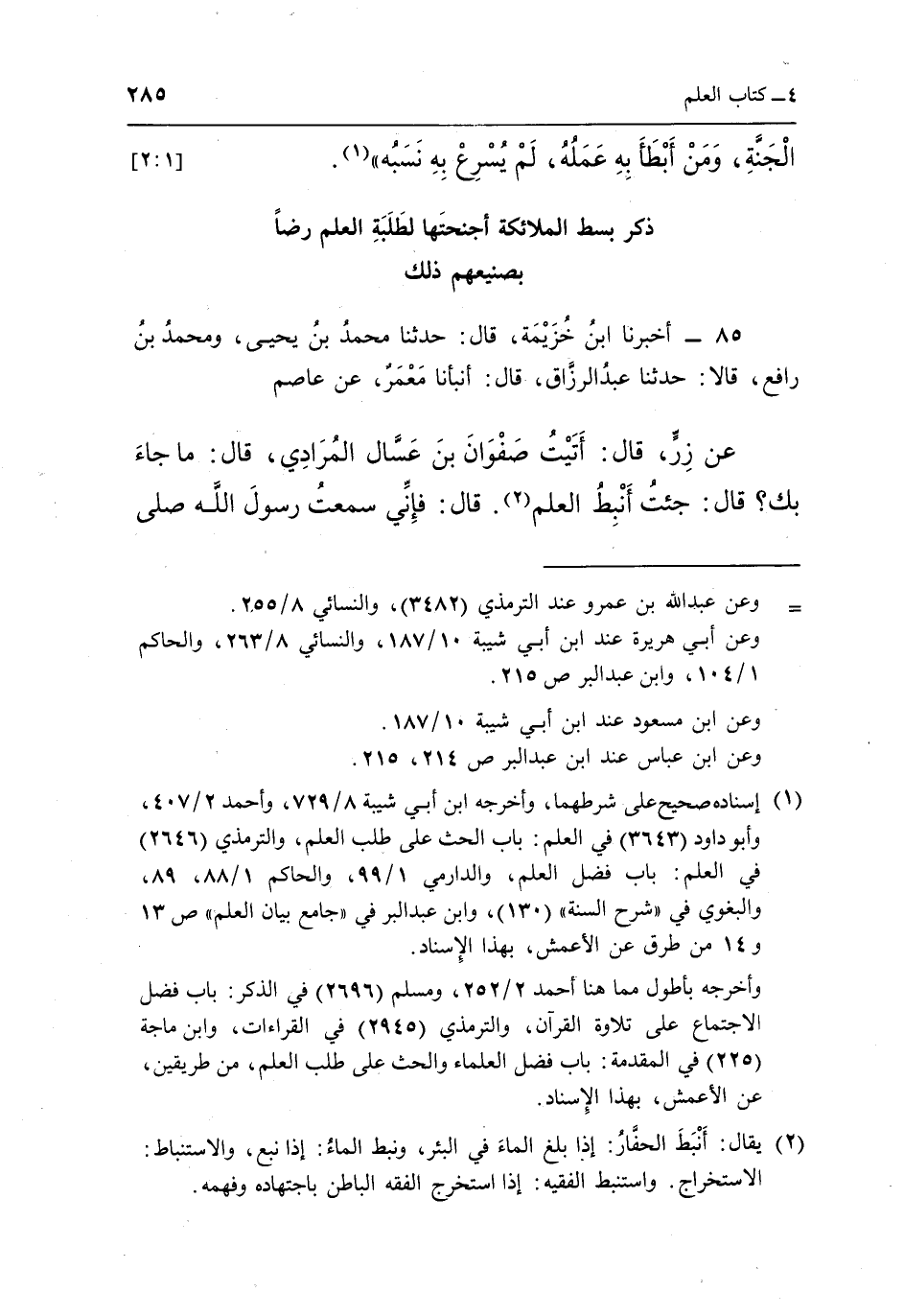 85 - أخبرنا بْنِ خُزَيْمَةَ قَالَ حَدَّثَنَا مُحَمَّدُ بْنُ يَحْيَى وَمُحَمَّدُ بْنُ رَافِعٍ قَالَا حَدَّثَنَا عَبْدُ الرَّزَّاقِ قَالَ: أَنْبَأَنَا مَعْمَرٌ عَنْ عَاصِمٍ عَنْ زِرٍّ قَالَ: أَتَيْتُ صَفْوَانَ بْنَ عَسَّالٍ الْمُرَادِيَّ قَالَ: مَا جَاءَ بِكَ؟ قَالَ: جِئْتُ أَنْبِطُ الْعِلْمَ1قَالَ: فَإِنِّي سَمِعْتُ رَسُولَ الله صلى