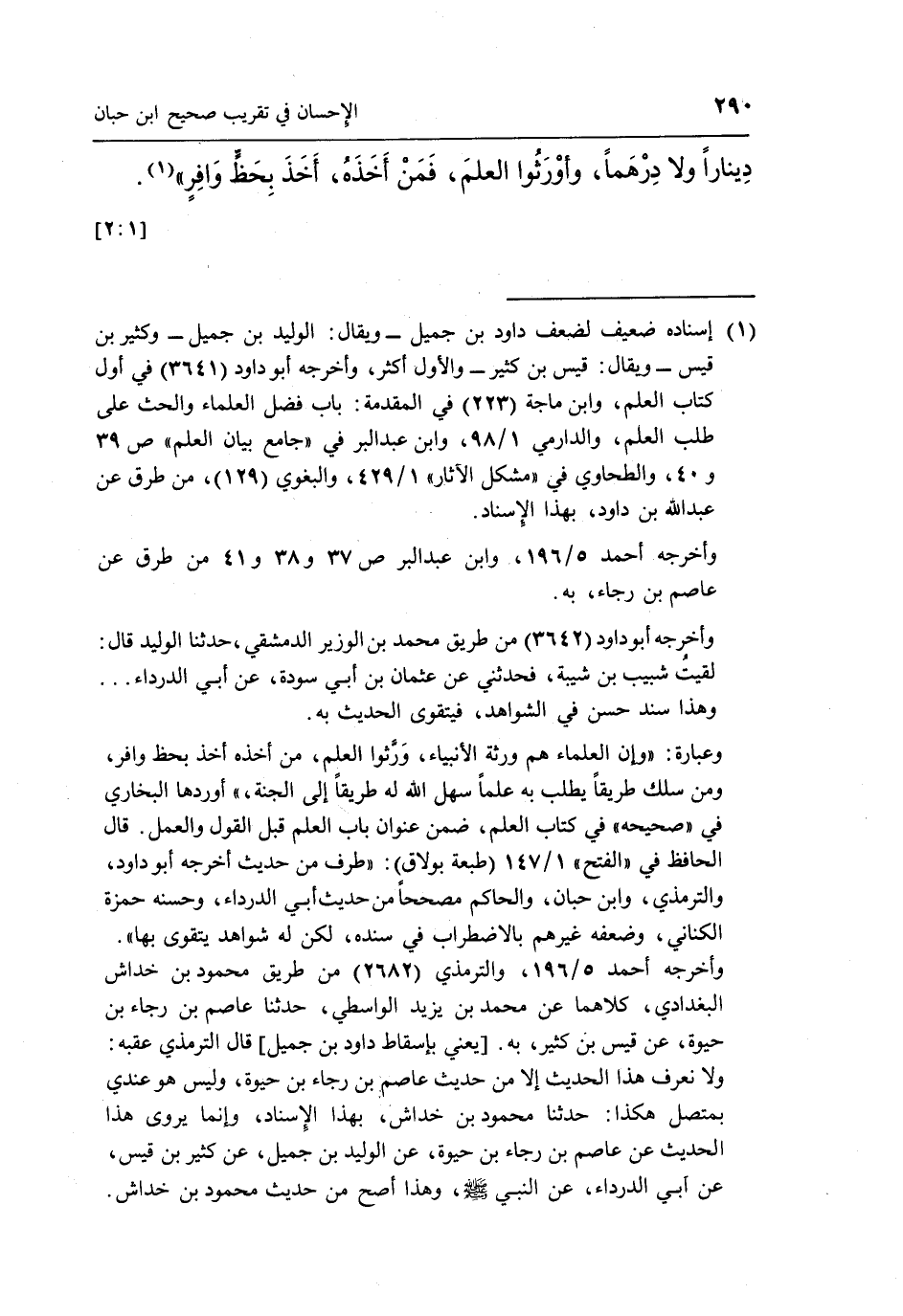وعبارة: "وإن العلماء هم ورثة الأنبياء، ورَّثوا العلم، من أخذه أخذ بحظ وافر، ومن سلك طريقاً يطلب به علماً سهل الله له طريقاً إلى الجنة" أوردها البخاري في "صحيحه" في كتاب العلم، ضمن عنوان باب العلم قبل القول والعمل. قال الحافظ في "الفتح" 1/147 "طبعة بولاق": "طرف من حديث أخرجه أبو داود، والترمذي، وابن حبان، والحاكم مصححاً من حديث أبي الدرداء، وحسنه حمزة الكناني، وضعفه غيرهم بالاضطراب في سنده، لكن له شواهد يتقوى بها".