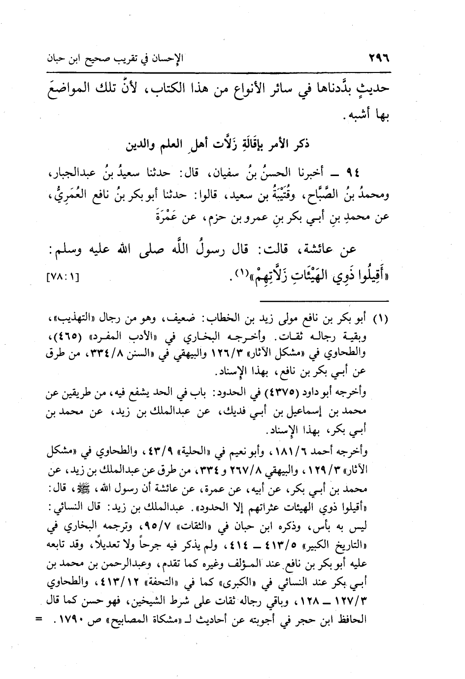 94 - أَخْبَرَنَا الْحَسَنُ بْنُ سُفْيَانَ قَالَ حَدَّثَنَا سَعِيدُ بْنُ عَبْدِ الْجَبَّارِ وَمُحَمَّدُ بْنُ الصَّبَّاحِ وَقُتَيْبَةُ بْنُ سَعِيدٍ قَالُوا حَدَّثَنَا أَبُو بَكْرِ بْنُ نَافِعٍ الْعُمَرِيُّ عَنْ مُحَمَّدِ بْنِ أَبِي بَكْرِ بْنِ عَمْرِو بْنِ حَزْمٍ عَنْ عَمْرَةَ عَنْ عَائِشَةَ قَالَتْ: قَالَ رَسُولُ اللَّهِ صَلَّى اللَّهُ عَلَيْهِ وَسَلَّمَ: "أقيلوا ذوي الهيئات زلاتهم" 1. [78:1]