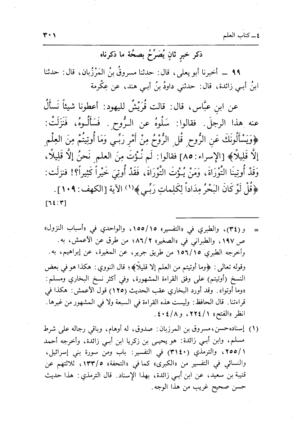 99 - أَخْبَرَنَا أَبُو يَعْلَى قَالَ حَدَّثَنَا مَسْرُوقُ بْنُ الْمَرْزُبَانِ قَالَ حَدَّثَنَا بن أَبِي زَائِدَةَ قَالَ حَدَّثَنِي دَاوُدُ بْنُ أَبِي هِنْدٍ عَنْ عِكْرِمَةَ عَنِ بن عَبَّاسٍ قَالَ قَالَتْ قُرَيْشٌ لِلْيَهُودِ أَعْطُونَا شَيْئًا نَسْأَلُ عَنْهُ هَذَا الرَّجُلَ فَقَالُوا سَلُوهُ عَنِ الرُّوحِ فَسَأَلُوهُ فَنَزَلَتْ {وَيَسْأَلونَكَ عَنِ الرُّوحِ قُلِ الرُّوحُ مِنْ أَمْرِ رَبِّي وَمَا أُوتِيتُمْ مِنَ الْعِلْمِ إِلَّا قَلِيلاً} فَقَالُوا: لَمْ نُؤْتَ مِنَ الْعِلْمِ نَحْنُ إِلَّا قَلِيلًا وَقَدْ أُوتِينَا التَّوْرَاةَ وَمَنْ يُؤْتَ التَّوْرَاةَ فَقَدْ أُوتِيَ خَيْرًا كَثِيرًا فَنَزَلَتْ {قُلْ لَوْ كَانَ الْبَحْرُ مِدَاداً لِكَلِمَاتِ رَبِّي} الْآيَةَ "1 [الكهف: 109] . [64:3]