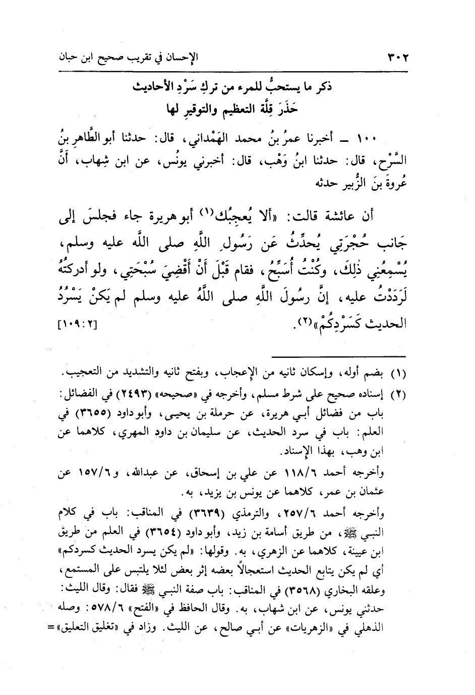 100 - أَخْبَرَنَا عُمَرُ بْنُ مُحَمَّدٍ الْهَمْدَانِيُّ قَالَ حَدَّثَنَا أَبُو الطاهر بن السرح قال حدثنا بن وهب قال أخبرني يونس عن بن شِهَابٍ أَنَّ عُرْوَةَ بْنَ الزُّبَيْرِ حَدَّثَهُ أَنَّ عَائِشَةَ قَالَتْ: "أَلَا يُعْجِبُكَ1 أَبُو هُرَيْرَةَ جَاءَ فَجَلَسَ إِلَى جَانِبِ حُجْرَتِي يُحَدِّثُ عَنْ رَسُولِ اللَّهِ صَلَّى اللَّهُ عَلَيْهِ وَسَلَّمَ يُسْمِعُنِي ذَلِكَ وَكُنْتُ أُسَبِّحُ فَقَامَ قَبْلَ أَنْ أَقْضِيَ سُبْحَتِي وَلَوْ أَدْرَكْتُهُ لَرَدَدْتُ عَلَيْهِ إِنَّ رَسُولَ اللَّهِ صَلَّى اللَّهُ عَلَيْهِ وَسَلَّمَ لَمْ يَكُنْ يَسْرُدُ الْحَدِيثَ كَسَرْدِكُمْ"2. [109:2]
