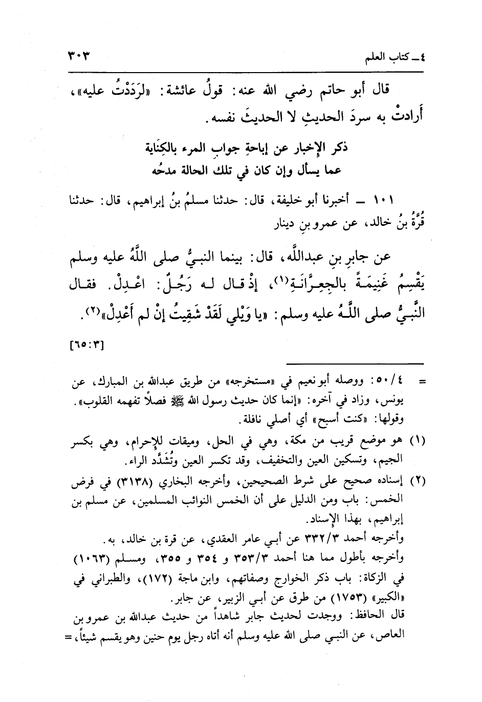 101 - أَخْبَرَنَا أَبُو خَلِيفَةَ قَالَ حَدَّثَنَا مُسْلِمُ بْنُ إِبْرَاهِيمَ قَالَ حَدَّثَنَا قُرَّةُ بْنُ خَالِدٍ عَنْ عَمْرِو بْنِ دِينَارٍ عَنْ جَابِرِ بْنِ عَبْدِ اللَّهِ قَالَ: بَيْنَمَا النَّبِيُّ صَلَّى اللَّهُ عَلَيْهِ وَسَلَّمَ يَقْسِمُ غَنِيمَةً بِالْجِعْرَانَةِ1 إِذْ قَالَ لَهُ رَجُلٌ: اعْدِلْ فَقَالَ النَّبِيُّ صَلَّى اللَّهُ عَلَيْهِ وَسَلَّمَ: "يَا وَيْلِي لَقَدْ شَقِيتُ إِنْ لم أعدل" 2. [65:3]