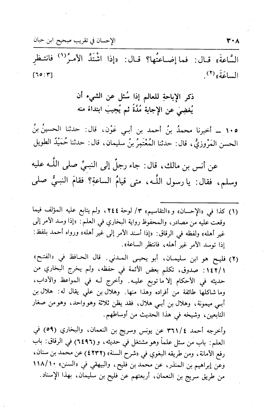 1 كذا في "الإحسان" و"التقاسيم" 3/244، ولم يتابع عليه المؤلف فيما وقعت عليه من مصادر، والمحفوظ رواية البخاري في العلم: "إذا وسد الأمر إلى غير أهله" ولفظه في الرقاق: "إذا أسند الأمر إلى غير أهله" ورواه أحمد بلفظ: "إذا توسد الأمر غير أهله، فانتظر الساعة".