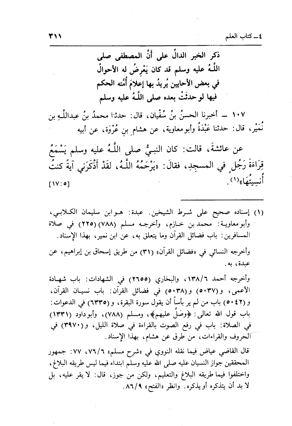107 - أَخْبَرَنَا الْحَسَنُ بْنُ سُفْيَانَ قَالَ حَدَّثَنَا مُحَمَّدُ بْنُ عَبْدِ اللَّهِ بْنِ نُمَيْرٍ قَالَ حَدَّثَنَا عَبْدَةُ وَأَبُو مُعَاوِيَةَ عَنْ هِشَامِ بْنِ عُرْوَةَ عَنْ أَبِيهِ عَنْ عَائِشَةَ قَالَتْ كَانَ النَّبِيُّ صَلَّى اللَّهُ عَلَيْهِ وَسَلَّمَ يَسْمَعُ قِرَاءَةَ رَجُلٍ فِي الْمَسْجِدِ فَقَالَ: "يَرْحَمُهُ الله لقد أذكرني آية كنت أنسيتها"1. [17:5]