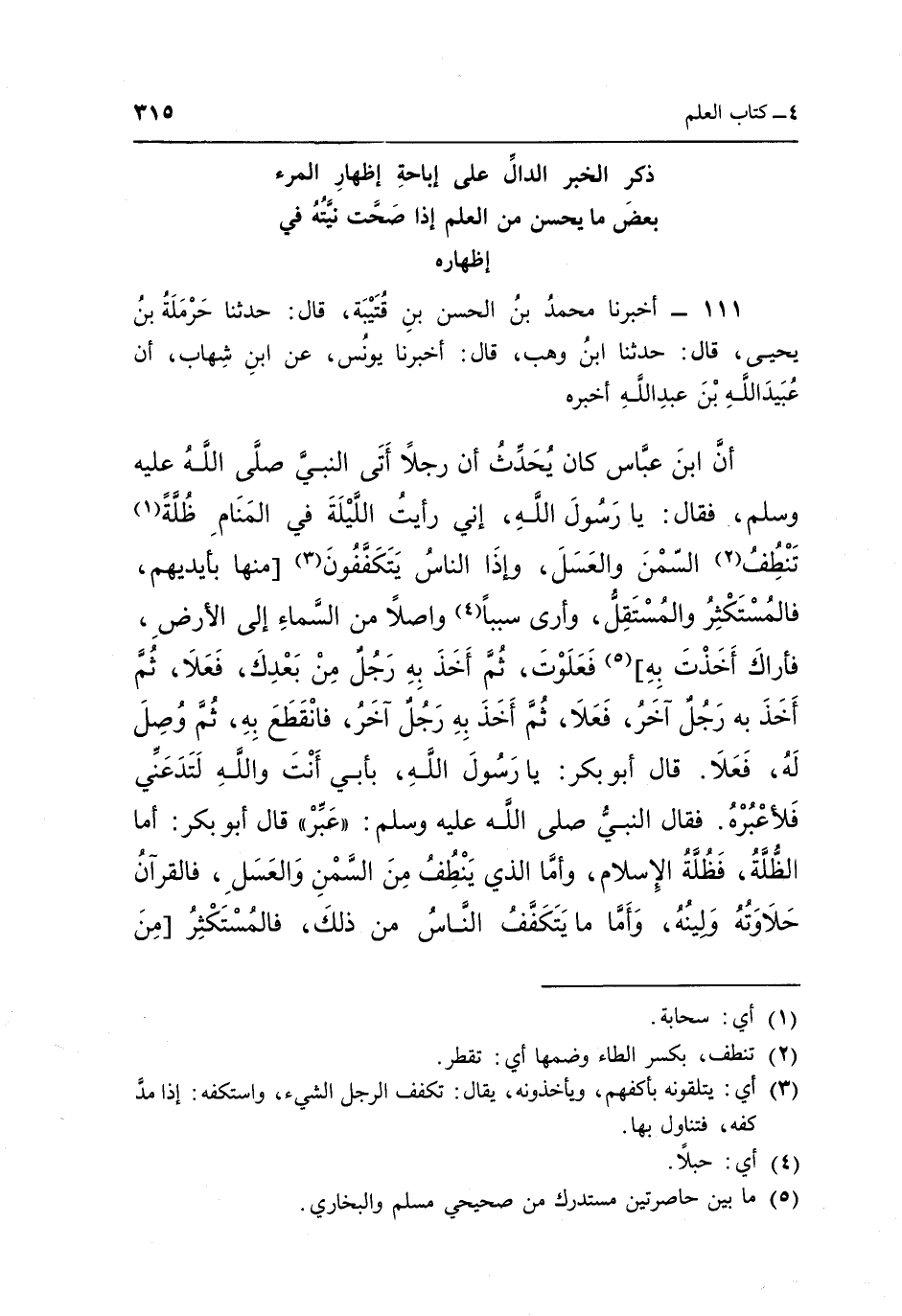111 - أَخْبَرَنَا مُحَمَّدُ بْنُ الْحَسَنِ بْنِ قُتَيْبَةَ قَالَ حَدَّثَنَا حَرْمَلَةُ بْنُ يَحْيَى قال حدثنا بن وهب قال أخبرنا يونس عن بن شِهَابٍ أَنَّ عُبَيْدَ اللَّهِ بْنَ عَبْدِ اللَّهِ أخبره أن بن عَبَّاسٍ كَانَ يُحَدِّثُ أَنَّ رَجُلًا أَتَى النَّبِيَّ صَلَّى اللَّهُ عَلَيْهِ وَسَلَّمَ فَقَالَ: يَا رسول اللَّهِ إِنِّي رَأَيْتُ اللَّيْلَةَ فِي الْمَنَامِ ظُلَّةً1 تَنْطِفُ2 السَّمْنَ وَالْعَسَلَ وَإِذَا النَّاسُ يَتَكَفَّفُونَ3 مِنْهَا بِأَيْدِيهِمْ فَالْمُسْتَكْثِرُ وَالْمُسْتَقِلُّ وَأَرَى سَبَبًا4 وَاصِلًا مِنَ السَّمَاءِ إِلَى الْأَرْضِ فَأَرَاكَ أَخَذْتَ بِهِ5 فَعَلَوْتَ ثُمَّ أَخَذَ بِهِ رَجُلٌ مِنْ بَعْدِكَ فَعَلَا ثُمَّ أَخَذَ بِهِ رَجُلٌ آخَرُ فَعَلَا ثُمَّ أَخَذَ بِهِ رَجُلٌ آخَرُ فَانْقَطَعَ بِهِ ثُمَّ وُصِلَ لَهُ فَعَلَا قَالَ: أَبُو بَكْرٍ: يَا رَسُولَ اللَّهِ بِأَبِي أَنْتَ وَاللَّهِ لَتَدَعَنِّي فَلَأَعْبُرُهُ فَقَالَ النَّبِيُّ صَلَّى اللَّهُ عَلَيْهِ وَسَلَّمَ: "عَبِّرْ" قَالَ: أَبُو بَكْرٍ أَمَّا الظُّلَّةُ فَظُلَّةُ الْإِسْلَامِ وَأَمَّا الَّذِي يَنْطِفُ مِنَ السَّمْنِ وَالْعَسَلِ فَالْقُرْآنُ حَلَاوَتُهُ وَلِينُهُ وَأَمَّا مَا يَتَكَفَّفُ النَّاسُ مِنْ ذلك فالمستكثر من