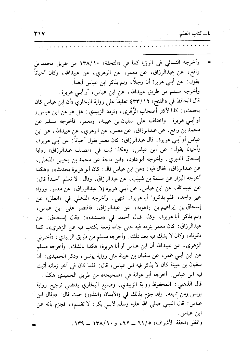 قال الحافظ في "الفتح" 12/433 تعليقاً على رواية البخاري: "أن بن عباس كان يحدث" كذا لأكثر أصحاب الزهري، وتردد الزبيدي: هل هو عن بن عباس، أو أبي هريرة. واختلف على سفيان بن عيينة، ومعمر، فأخرجه مسلم عن محمد بن رافع، عن عبد الرزاق، عن معمر، عن الزهري، عن عبيد الله عن ابن عباس أو أبي هريرة. قال عبد الرزاق: كان معمر يقول أحياناً: عن أبي هريرة، وأحياناً يقول: عن ابن عباس، وهكذا ثبت في "مصنف عبد الرزاق" رواية إسحاق الدبري. وأخرجه أبو داود، وابن ماجة عن محمد بن يحيى الذهلي، عن عبد الرزاق، فقال فيه: "عن ابن عباس قال: كان أبو هريرة يحدث"، وهكذا أخرجه البزار عن سلمة بن شبيب، عن عبد الرزاق، وقال: لا نعلم أحداً قال: عن عبيد الله، عن ابن عباس، عن أبي هريرة، إلا عبد الرزاق، عن معمر. ورواه غير واحد، فلم يذكروا أبا هريرة. انتهى. وأخرجه الذهلي في "العلل" عن إسحاق بن إبراهيم بن راهويه، عن عبد الرزاق، فاقتصر على ابن عباس، ولم يذكر أبا هريرة، وكذا قال أحمد في "مسنده": "قال إسحاق: عن عبد الرزاق: كان معمر يتردد فيه حتى جاءه زمعة بكتاب فيه عن الزهري". كما ذكرناه، وكان لا يشك فيه بعد ذلك. وأخرجه مسلم من طريق الزبيدي: "أخبرني الزهري، عن عبيد الله أن ابن عباس أو أبا هريرة" هكذا بالشك. وأخرجه مسلم عن ابن أبي عمر، عن سفيان بن عيينة مثل رواية يونس، وذكر الحميدي: أن سفيان بن عيينة كان لا يذكر فيه ابن عباس، قال: فلما كان في آخر زمانه أثبت فيه ابن عباس. أخرجه أبو عوانة في "صحيحه" من طريق الحميدي هكذا.