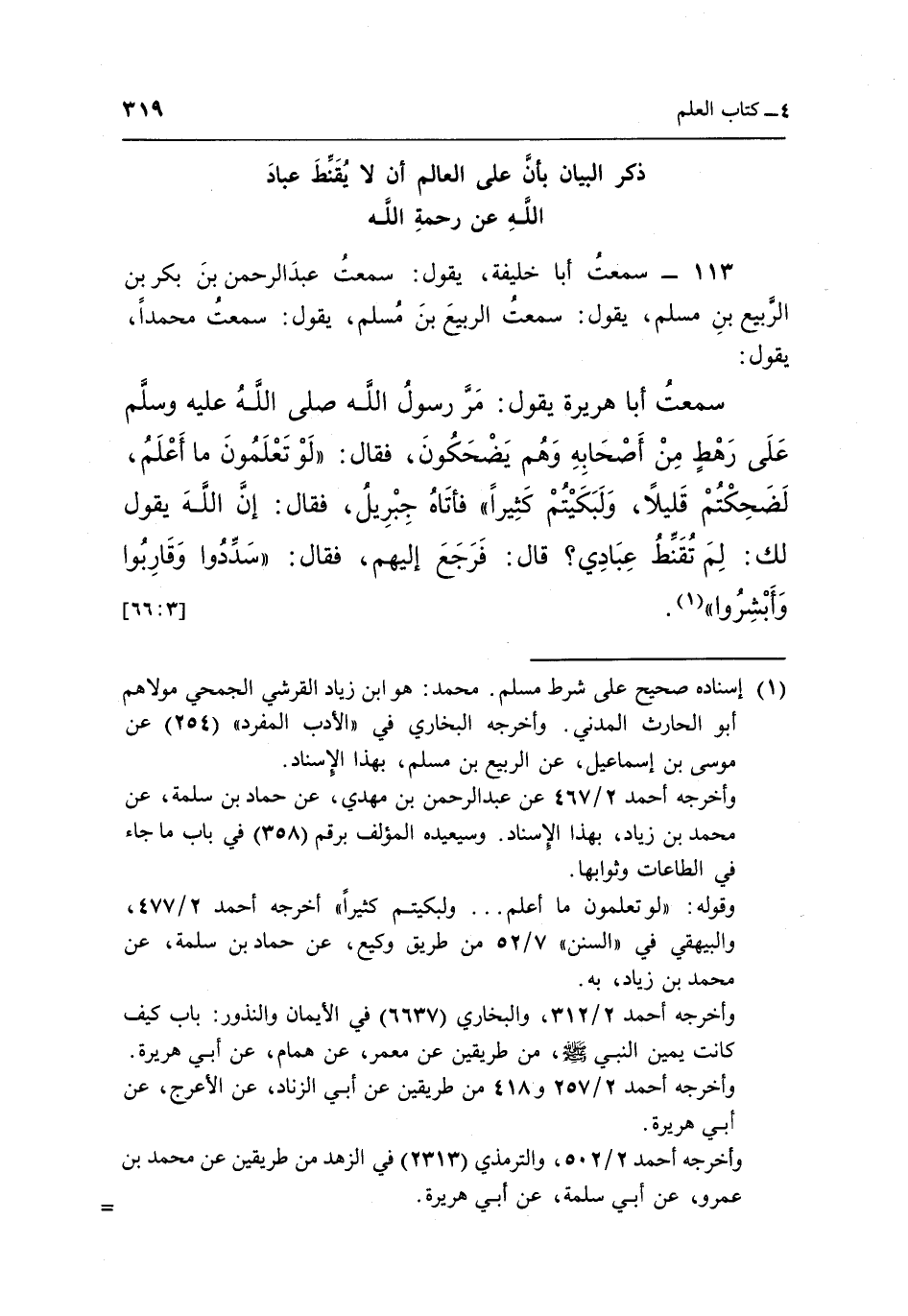 113 - سَمِعْتُ أَبَا خَلِيفَةَ يَقُولُ سَمِعْتُ عَبْدَ الرَّحْمَنِ بْنَ بَكْرِ بْنِ الرَّبِيعِ بْنِ مُسْلِمٍ يَقُولُ سَمِعْتُ الربيع بن مسلم يقول سمعت محمدا يقول: سَمِعْتُ أَبَا هُرَيْرَةَ يَقُولُ: مَرَّ رَسُولُ اللَّهِ صَلَّى اللَّهُ عَلَيْهِ وَسَلَّمَ عَلَى رَهْطٍ مِنْ أَصْحَابِهِ وَهُمْ يَضْحَكُونَ فَقَالَ: "لَوْ تَعْلَمُونَ مَا أَعْلَمُ لَضَحِكْتُمْ قَلِيلًا وَلَبَكَيْتُمْ كَثِيرًا" فَأَتَاهُ جِبْرِيلُ فَقَالَ: إِنَّ اللَّهَ يَقُولُ لَكَ لِمَ تُقَنِّطُ عِبَادِي قَالَ: فَرَجَعَ إِلَيْهِمْ فَقَالَ: "سَدِّدُوا وَقَارِبُوا وأبشروا"1. [66:3]
