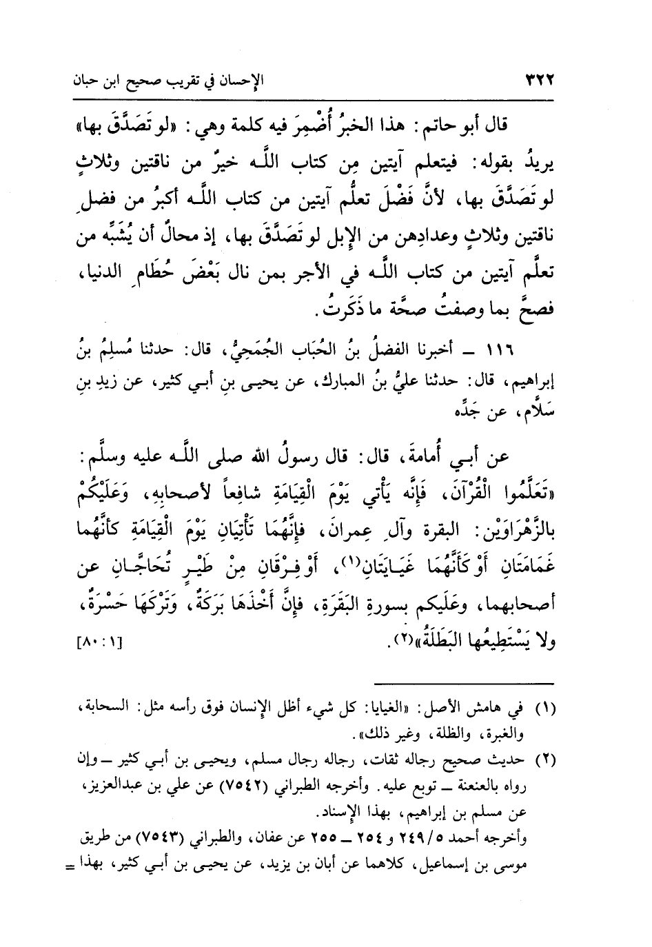 116 - أَخْبَرَنَا الْفَضْلُ بْنُ الْحُبَابِ الْجُمَحِيُّ قَالَ حَدَّثَنَا مُسْلِمُ بْنُ إِبْرَاهِيمَ قَالَ حَدَّثَنَا عَلِيُّ بْنُ الْمُبَارَكِ عَنْ يَحْيَى بْنِ أَبِي كَثِيرٍ عَنْ زَيْدِ بْنِ سَلَّامٍ عَنْ جَدِّهِ عَنْ أَبِي أُمَامَةَ قَالَ: قَالَ رَسُولُ اللَّهِ صَلَّى اللَّهُ عَلَيْهِ وَسَلَّمَ: "تَعَلَّمُوا الْقُرْآنَ فَإِنَّهُ يَأْتِي يَوْمَ الْقِيَامَةِ شَافِعًا لِأَصْحَابِهِ وَعَلَيْكُمْ بِالزَّهْرَاوَيْنِ الْبَقَرَةِ وَآلِ عِمْرَانَ فَإِنَّهُمَا تَأْتِيَانِ يَوْمَ الْقِيَامَةِ كَأَنَّهُمَا غَمَامَتَانِ أَوْ كَأَنَّهُمَا غَيَايَتَانِ1 أَوْ فِرْقَانِ مِنْ طَيْرٍ تُحَاجَّانِ عَنْ أَصْحَابِهِمَا وَعَلَيْكُمْ بِسُورَةِ الْبَقَرَةِ فَإِنَّ أَخْذَهَا بَرَكَةٌ وَتَرْكَهَا حَسْرَةٌ وَلَا يَسْتَطِيعُهَا الْبَطَلَةُ"2. [80:1]