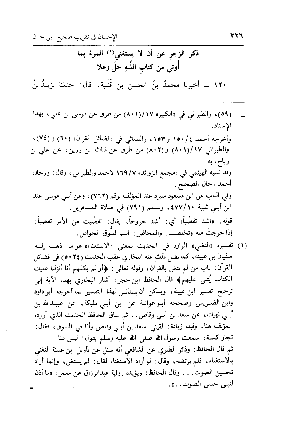 1 تفسيره "التغني" الوارد في الحديث بمعنى "الاستغناء" هو ما ذهب إليه سفيان بن عيينة، كما نقل ذلك عنه البخاري عقب الحديث "5402" في فضائل القرآن: باب من لم يتغن بالقرآن، وقوله تعالى: {أَوَلَمْ يَكْفِهِمْ أَنَّا أَنْزَلْنَا عَلَيْكَ الْكِتَابَ يُتْلَى عَلَيْهِمْ} قال ابن حجر: أشار البخاري بهذه الآية إلى ترجيح تفسير ابن عيينة، ويمكن أن يستأنس لهذا التفسير بما أخرجه أبو داود وابن الضريس وصححه أبو عوانة عن ابن أبي مليكة، عن عبيد الله بن أبي نهيك، عن سعد بن أبي وقاص، ثم ساق الحافظ الحديث الذي أورده المؤلف هنا، وقبله زيادة: لقبني سعد بن أبي وقاص وأنا في السوق، فقال: تجار كسبة، سمعت رسول الله صلى الله عليه وسلم: يقول ليس منا.