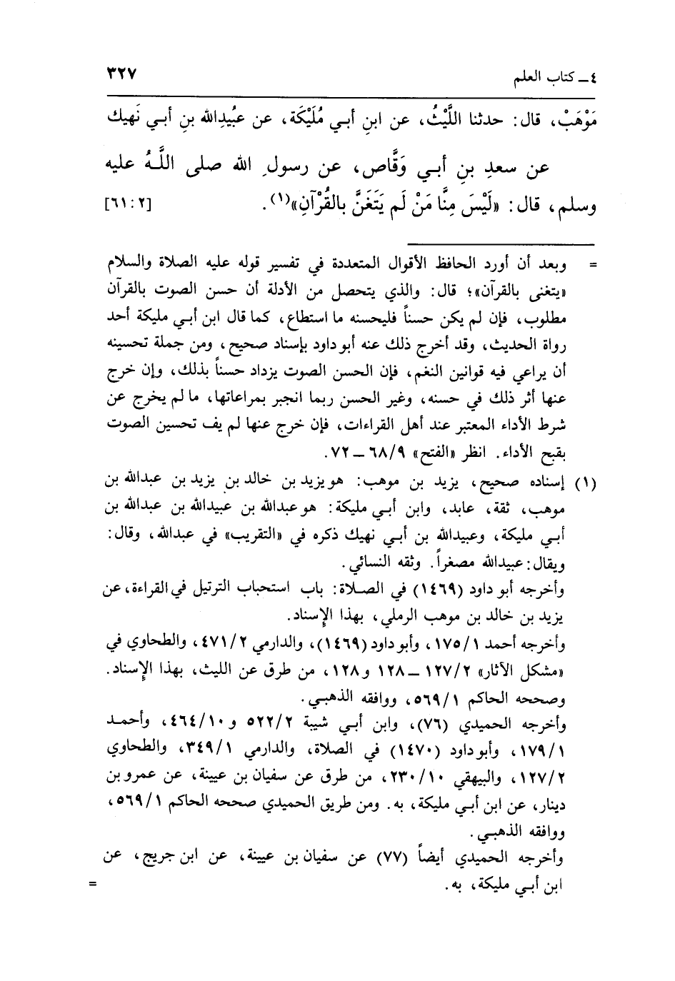 موهب قال حدثنا الليث عن بن أَبِي مُلَيْكَةَ عَنْ عُبَيْدِ اللَّهِ بْنِ أَبِي نَهِيكٍ عَنْ سَعْدِ بْنِ أَبِي وَقَّاصٍ عَنْ رَسُولِ اللَّهِ صَلَّى اللَّهُ عَلَيْهِ وَسَلَّمَ قال: "لَيْسَ مِنَّا مَنْ لَمْ يَتَغَنَّ بِالْقُرْآنِ"1. [61:2]
