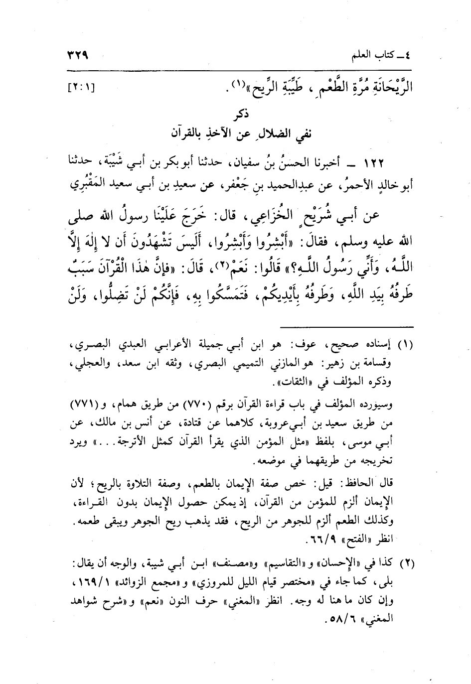 122 - أَخْبَرَنَا الْحَسَنُ بْنُ سُفْيَانَ حَدَّثَنَا أَبُو بَكْرِ بْنُ أَبِي شَيْبَةَ حَدَّثَنَا أَبُو خَالِدٍ الْأَحْمَرُ عَنْ عَبْدِ الْحَمِيدِ بْنِ جَعْفَرٍ عَنْ سَعِيدِ بْنِ أَبِي سَعِيدٍ الْمَقْبُرِيِّ عَنْ أَبِي شُرَيْحٍ الْخُزَاعِيِّ قَالَ خَرَجَ عَلَيْنَا رَسُولُ اللَّهِ صَلَّى اللَّهُ عَلَيْهِ وَسَلَّمَ فَقَالَ: "أَبْشِرُوا وَأَبْشِرُوا أَلَيْسَ تَشْهَدُونَ أَنْ لَا إِلَهَ إِلَّا اللَّهُ وَأَنِّي رَسُولُ اللَّهِ"؟ قَالُوا: نَعَمْ1 قَالَ: "فَإِنَّ هَذَا الْقُرْآنَ سَبَبٌ طَرَفُهُ بِيَدِ اللَّهِ وَطَرَفُهُ بِأَيْدِيكُمْ فَتَمَسَّكُوا به فإنكم لن تضلوا ولن