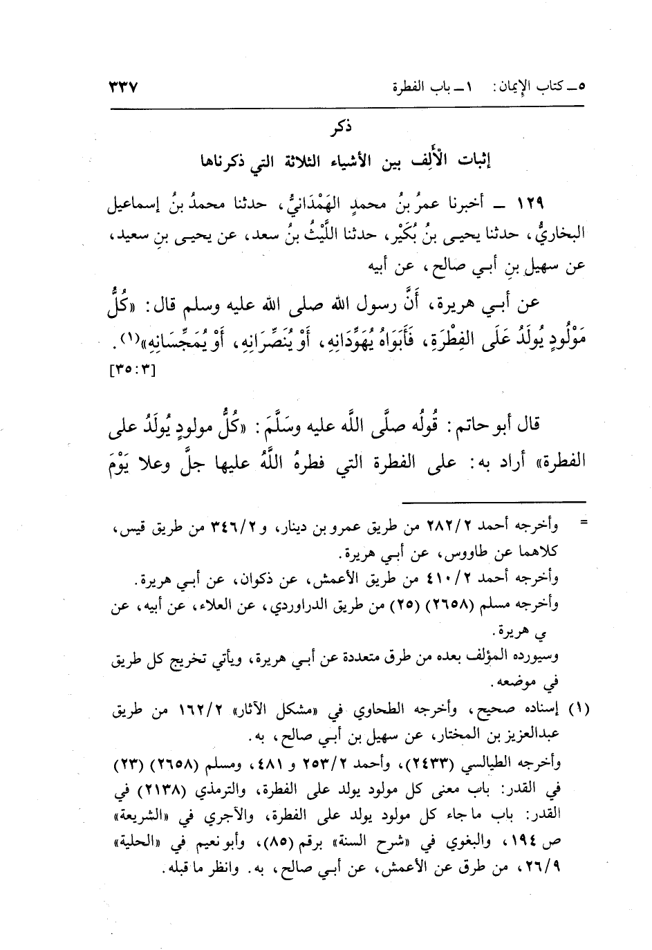 129 - أَخْبَرَنَا عُمَرُ بْنُ مُحَمَّدٍ الْهَمْدَانِيُّ حَدَّثَنَا مُحَمَّدُ بْنُ إِسْمَاعِيلَ الْبُخَارِيُّ حَدَّثَنَا يَحْيَى بْنُ بُكَيْرٍ حَدَّثَنَا اللَّيْثُ بْنُ سَعْدٍ عَنْ يَحْيَى بْنِ سَعِيدٍ عَنْ سُهَيْلِ بْنِ أَبِي صَالِحٍ عَنْ أَبِيهِ عَنْ أَبِي هُرَيْرَةَ أَنَّ رَسُولَ اللَّهِ صَلَّى اللَّهُ عَلَيْهِ وَسَلَّمَ قَالَ: "كُلُّ مَوْلُودٍ يُولَدُ عَلَى الْفِطْرَةِ فَأَبَوَاهُ يُهَوِّدَانِهِ أَوْ يُنَصِّرَانِهِ أَوْ يُمَجِّسَانِهِ"1.