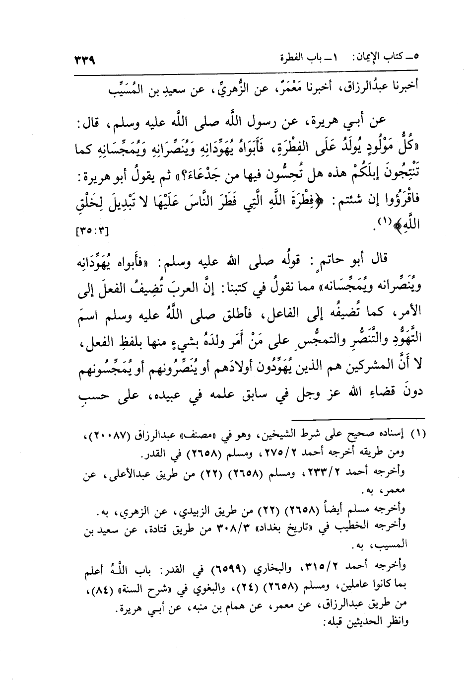 130 - أَخْبَرَنَا عَبْدُ اللَّهِ بْنُ مُحَمَّدٍ الْأَزْدِيُّ حَدَّثَنَا إِسْحَاقُ بْنُ إِبْرَاهِيمَ أَخْبَرَنَا عَبْدُ الرَّزَّاقِ أَخْبَرَنَا مَعْمَرٌ عَنِ الزُّهْرِيِّ عَنْ سَعِيدِ بْنِ الْمُسَيِّبِ عَنْ أَبِي هُرَيْرَةَ عَنْ رَسُولِ اللَّهِ صَلَّى اللَّهُ عَلَيْهِ وَسَلَّمَ قَالَ: "كُلُّ مَوْلُودٍ يُولَدُ عَلَى الْفِطْرَةِ فَأَبَوَاهُ يُهَوِّدَانِهِ وَيُنَصِّرَانِهِ وَيُمَجِّسَانِهِ كَمَا تَنْتِجُونَ إِبِلَكُمْ هَذِهِ هَلْ تُحِسُّونَ فِيهَا مِنْ جَدْعَاءَ؟ " ثُمَّ يَقُولُ أَبُو هُرَيْرَةَ: فَاقْرَؤُوا إن شئتم {فِطْرَتَ اللَّهِ الَّتِي فَطَرَ النَّاسَ عَلَيْهَا لَا تَبْدِيلَ لِخَلْقِ اللَّهِ} "1. [35:3]