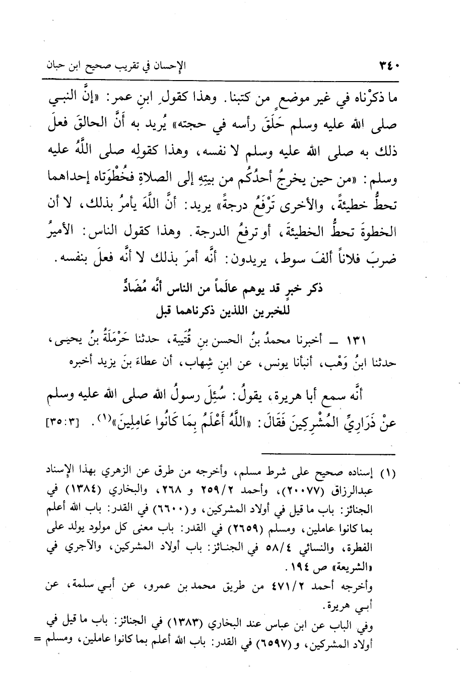 131 - أَخْبَرَنَا مُحَمَّدُ بْنُ الْحَسَنِ بْنِ قُتَيْبَةَ حَدَّثَنَا حَرْمَلَةُ بن يحيى حدثنا بن وهب أنبأنا يونس عن بن شِهَابٍ أَنَّ عَطَاءَ بْنَ يَزِيدَ أَخْبَرَهُ أَنَّهُ سَمِعَ أَبَا هُرَيْرَةَ يَقُولُ: سُئِلَ رَسُولُ اللَّهِ صَلَّى اللَّهُ عَلَيْهِ وَسَلَّمَ عَنْ ذَرَارِيِّ الْمُشْرِكِينَ فقال: "الله أعلم بما كانوا عاملين"1. [35:3]