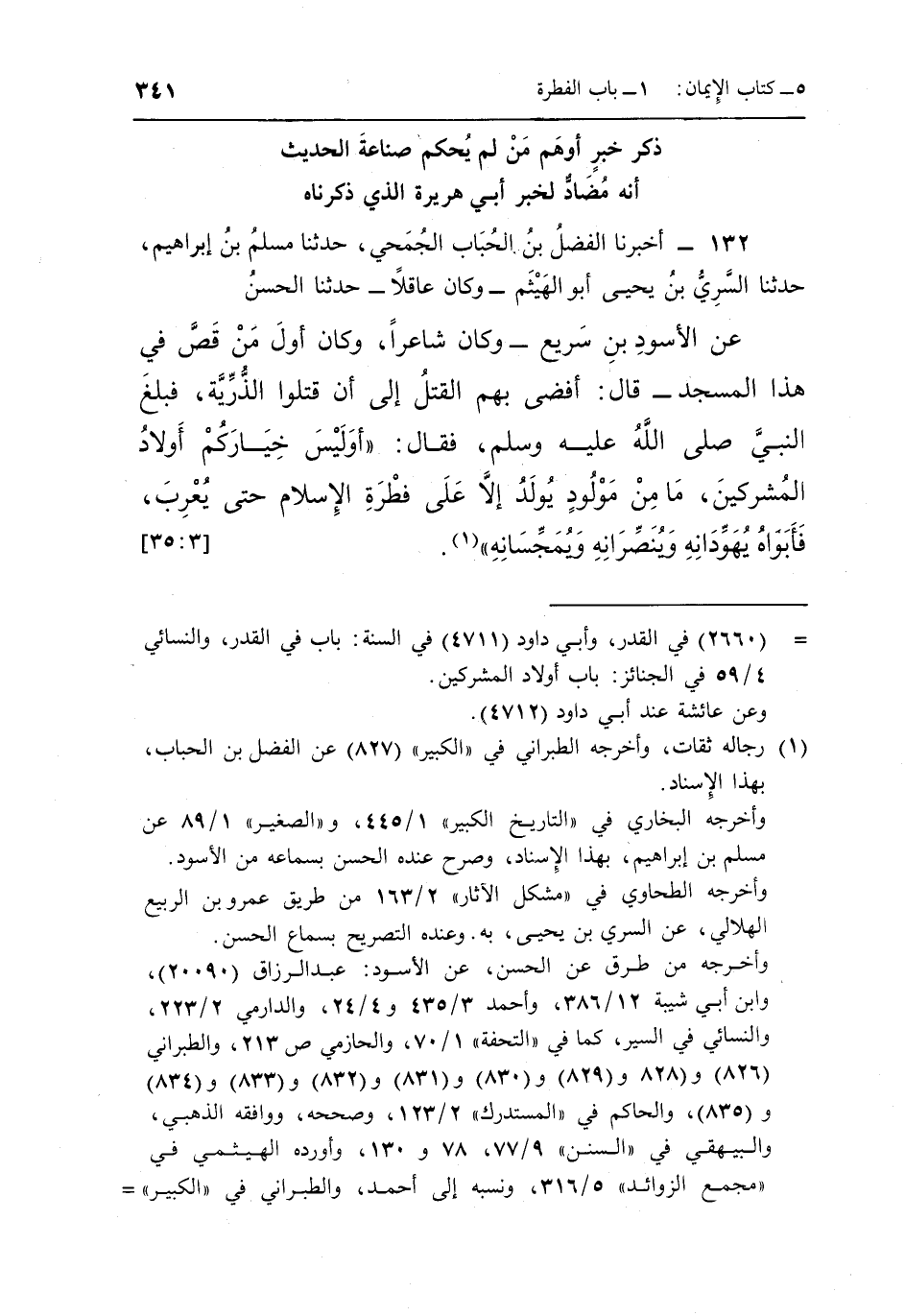 132 - أَخْبَرَنَا الْفَضْلُ بْنُ الْحُبَابِ الْجُمَحِيُّ حَدَّثَنَا مُسْلِمُ بْنُ إِبْرَاهِيمَ حَدَّثَنَا السَّرِيُّ بْنُ يَحْيَى أَبُو الْهَيْثَمِ وَكَانَ عَاقِلًا حَدَّثَنَا الْحَسَنُ عَنِ الْأَسْوَدِ بْنِ سَرِيعٍ وَكَانَ شَاعِرًا وَكَانَ أَوَّلَ مَنْ قَصَّ فِي هَذَا الْمَسْجِدِ قَالَ: أَفْضَى بِهِمُ الْقَتْلُ إِلَى أَنْ قَتَلُوا الذُّرِّيَّةَ فَبَلَغَ النَّبِيَّ صَلَّى اللَّهُ عَلَيْهِ وَسَلَّمَ فَقَالَ: "أَوَلَيْسَ خِيَارُكُمْ أَوْلَادَ الْمُشْرِكِينَ مَا مِنْ مَوْلُودٍ يُولَدُ إِلَّا عَلَى فِطْرَةِ الْإِسْلَامِ حَتَّى يُعْرِبَ فَأَبَوَاهُ يهودانه وينصرانه ويمجسانه"1. [35:3]