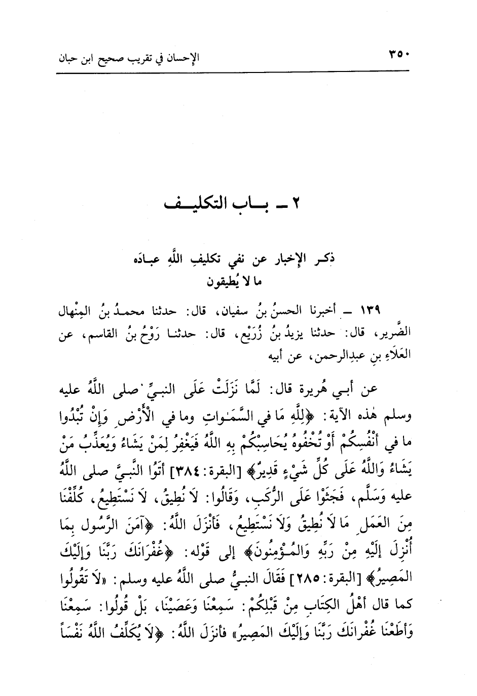 139 - أَخْبَرَنَا الْحَسَنُ بْنُ سُفْيَانَ قَالَ حَدَّثَنَا مُحَمَّدُ بْنُ الْمِنْهَالِ الضَّرِيرُ قَالَ حَدَّثَنَا يَزِيدُ بْنُ زُرَيْعٍ قَالَ حَدَّثَنَا رَوْحُ بْنُ الْقَاسِمِ عَنِ الْعَلَاءِ بْنِ عَبْدِ الرَّحْمَنِ عَنْ أَبِيهِ عَنْ أَبِي هُرَيْرَةَ قَالَ: لَمَّا نَزَلَتْ عَلَى النَّبِيِّ صَلَّى اللَّهُ عَلَيْهِ وَسَلَّمَ هَذِهِ الْآيَةُ {لِلَّهِ مَا فِي السَّمَاوَاتِ وَمَا فِي الْأَرْضِ وَإِنْ تُبْدُوا مَا فِي أَنْفُسِكُمْ أَو تُخْفُوهُ يُحَاسِبْكُمْ بِهِ اللَّهُ فَيَغْفِرُ لِمَنْ يَشَاءُ وَيُعَذِّبُ مَنْ يَشَاءُ وَاللَّهُ عَلَى كُلِّ شَيْءٍ قَدِيرٌ} أَتَوَا النَّبِيَّ صَلَّى اللَّهُ عَلَيْهِ وَسَلَّمَ فَجَثَوْا عَلَى الرُّكَبِ وَقَالُوا لَا نُطِيقُ لَا نَسْتَطِيعُ كُلِّفْنَا مِنَ الْعَمَلِ مَا لَا نُطِيقُ وَلَا نَسْتَطِيعُ فَأَنْزَلَ اللَّهُ {آمَنَ الرَّسُولُ بِمَا أُنْزِلَ إِلَيْهِ مِنْ رَبِّهِ وَالْمُؤْمِنُونَ} إلى قوله: {غُفْرَانَكَ رَبَّنَا وَإِلَيْكَ الْمَصِيرُ} فَقَالَ النَّبِيُّ صَلَّى اللَّهُ عَلَيْهِ وَسَلَّمَ: "لَا تَقُولُوا كَمَا قَالَ أَهْلُ الْكِتَابِ مِنْ قَبْلِكُمْ سَمِعْنَا وَعَصَيْنَا بَلْ قُولُوا سَمِعْنَا وَأَطَعْنَا غُفْرَانَكَ رَبَّنَا وَإِلَيْكَ الْمَصِيرُ" فَأَنْزَلَ اللَّهُ {لَا يُكَلِّفُ اللَّهُ نَفْساً2- بَابُ التَّكْلِيفِ