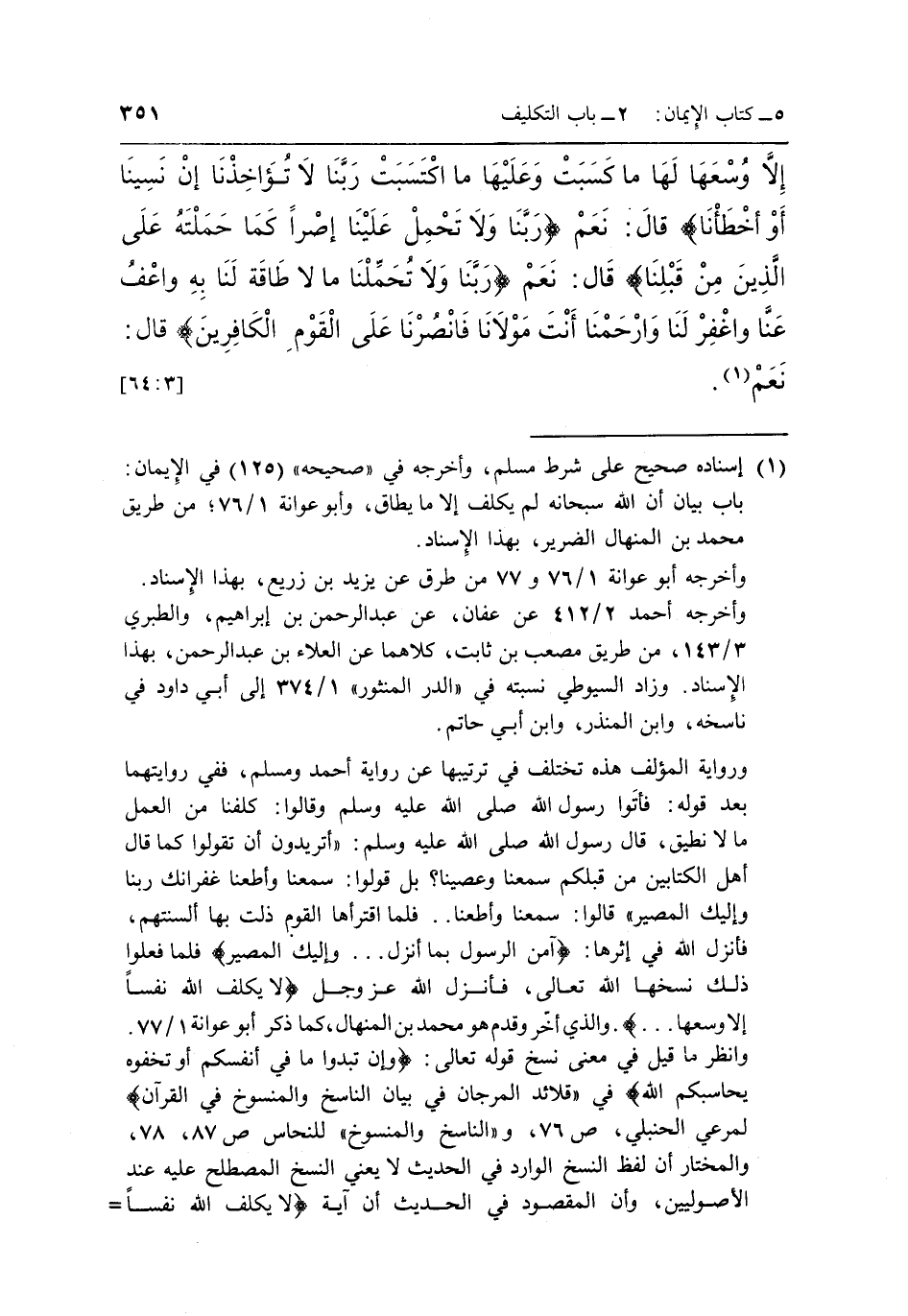 وراية المؤلف هذه تختلف في ترتيبها عن رواية أحمد ومسلم، ففي روايتهما بعد قوله: فأتَوا رسول الله صلى الله عليه وآله وسلم وقالوا: كلفنا من العمل ما لا نطيق، قال رسول الله صلى الله عليه وآله وسلم: "أتريدون أن تقولوا كما قال أهل الكتابين من قبلكم سمعنا وعصينا؟ بل قولوا: سمعنا وأطعنا غفرانك ربنا وإليك المصير" قالوا: سمعنا وأطعنا ... فلما اقترأها القوم ذلت بها ألسنتهم، فأنزل في إثرها: {آمَنَ الرَّسُولُ بِمَا أُنْزِلَ ... وَإِلَيْكَ الْمَصِيرُ} فلما فعلوا ذلك نسخها الله تعالى، فأنزل الله عز وجل: {لا يُكَلِّفُ اللَّهُ نَفْساً إِلَّا وُسْعَهَا ... } والذي أخّر وقدم هو محمد بن المنهال، كما ذكر أبو عوانة 1/77. وانظر ما قيل في معنى نسخ قوله تعالى: {وَإِنْ تُبْدُوا مَا فِي أَنْفُسِكُمْ أَو تُخْفُوهُ يُحَاسِبْكُمْ بِهِ اللَّهُ} في قلائد المرجان في بيان الناسخ والمنسوخ في القرآن" لمرعي الحنبلي ص76 و"الناسخ والمنسوخ" للنحاس ص87، 88، والمختار أن لفظ النسخ الوارد في الحديث لا يعني النسخ المصطلح عليه عند الأصوليين، وأن المقصود في الحديث أن آية {لا يُكَلِّفُ اللَّهُ نَفْساً إِلَّا وُسْعَهَا ... } نسخت الشدة التي اعترت الصحابة من فهم هذه الآية، وبينت المقصود من الآية الأولى وهو أن الله يؤاخذ على خواطر النفس إذا كانت على سبيل العزم والتصميم على الفعل.