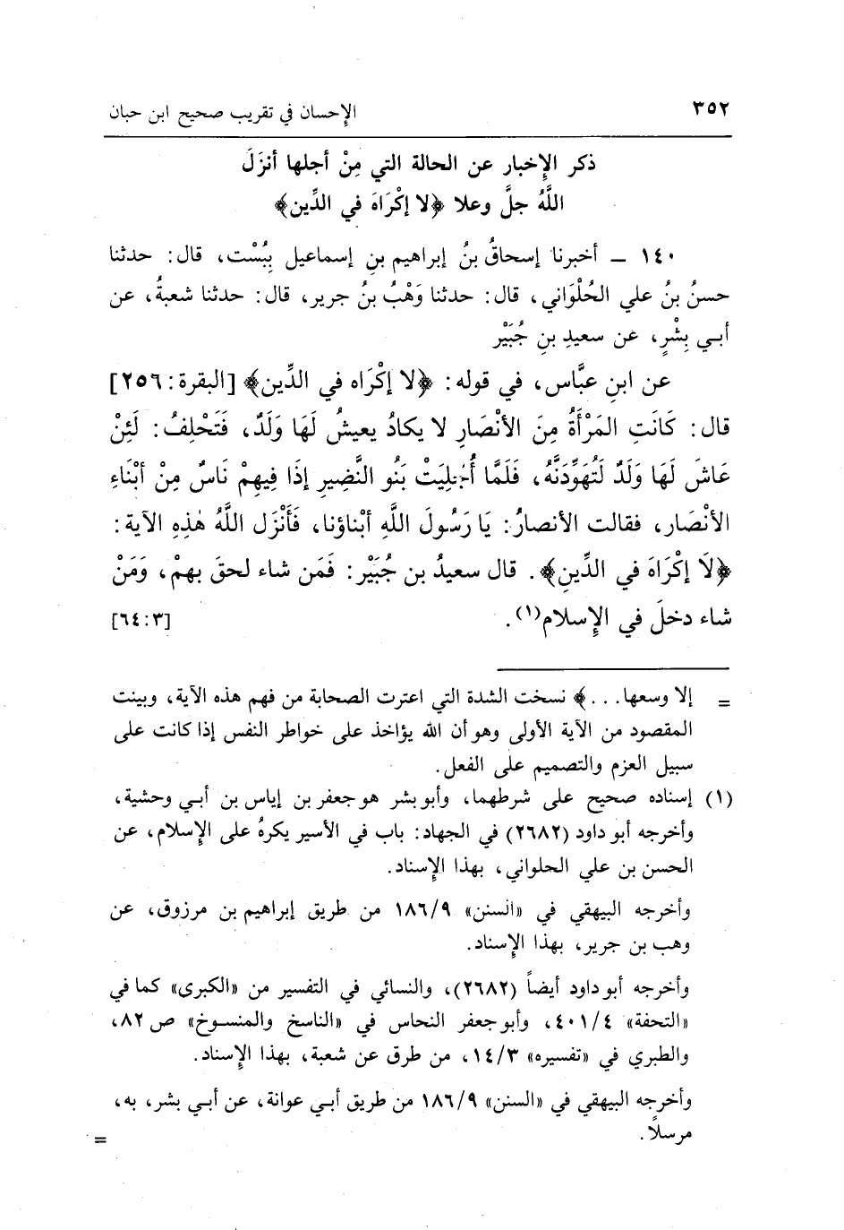 140 - أَخْبَرَنَا إِسْحَاقُ بْنُ إِبْرَاهِيمَ بْنِ إِسْمَاعِيلَ بِبُسْتَ قَالَ حَدَّثَنَا حَسَنُ بْنُ عَلِيٍّ الْحُلْوَانِيُّ قَالَ حَدَّثَنَا وَهْبُ بْنُ جَرِيرٍ قَالَ حَدَّثَنَا شُعْبَةُ عَنْ أَبِي بِشْرٍ عَنْ سَعِيدِ بْنِ جُبَيْرٍ عَنِ ابْنِ عَبَّاسٍ فِي قَوْلِهِ: {لَا إِكْرَاهَ فِي الدِّينِ} [البقرة: 256] قَالَ: كَانَتَ الْمَرْأَةُ مِنَ الْأَنْصَارِ لَا يَكَادُ يَعِيشُ لَهَا وَلَدٌ فَتَحْلِفُ لَئِنْ عَاشَ لَهَا وَلَدٌ لَتُهَوِّدَنَّهُ فَلَمَّا أُجْلِيَتْ بَنُو النَّضِيرِ إِذَا فِيهِمْ نَاسٌ مِنْ أَبْنَاءِ الْأَنْصَارِ فَقَالَتِ الْأَنْصَارُ: يَا رَسُولَ اللَّهِ أَبْنَاؤُنَا فَأَنْزَلَ اللَّهُ هَذِهِ الْآيَةَ {لَا إِكْرَاهَ فِي الدِّينِ} قَالَ سَعِيدُ بْنُ جُبَيْرٍ: فَمَنْ شَاءَ لَحِقَ بهم ومن شاء دخل في الإسلام1. [64:3]