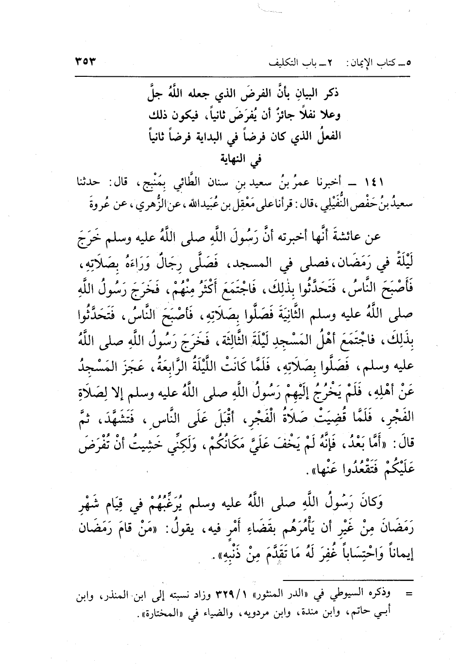 [141] أَخْبَرَنَا عُمَرُ بْنُ سَعِيدِ بْنِ سِنَانٍ الطَّائِيُّ بِمَنْبَجَ قَالَ حَدَّثَنَا سَعِيدُ بْنُ حَفْصٍ النُّفَيْلِيُّ قَالَ قَرَأْنَا عَلَى مَعْقِلِ بْنِ عُبَيْدِ اللَّهِ عَنِ الزُّهْرِيِّ عَنْ عُرْوَةَ عَنْ عَائِشَةَ أَنَّهَا أَخْبَرَتْهُ: أَنَّ رَسُولَ اللَّهِ صَلَّى اللَّهُ عَلَيْهِ وَسَلَّمَ خَرَجَ لَيْلَةً فِي رَمَضَانَ فَصَلَّى فِي الْمَسْجِدِ فَصَلَّى رِجَالٌ وَرَاءَهُ بِصَلَاتِهِ فَأَصْبَحَ النَّاسُ فَتَحَدَّثُوا بِذَلِكَ فَاجْتَمَعَ أَكْثَرَهُمْ مِنْهُمْ فَخَرَجَ رَسُولُ اللَّهِ صَلَّى اللَّهُ عَلَيْهِ وَسَلَّمَ الثَّانِيَةَ فَصَلَّوْا بِصَلَاتِهِ فَأَصْبَحَ النَّاسُ فَتَحَدَّثُوا بِذَلِكَ فَاجْتَمَعَ أَهْلُ الْمَسْجِدِ لَيْلَةَ الثَّالِثَةِ فَخَرَجَ رَسُولُ اللَّهِ صَلَّى اللَّهُ عَلَيْهِ وَسَلَّمَ فَصَلَّوْا بِصَلَاتِهِ فَلَمَّا كَانَتِ اللَّيْلَةُ الرَّابِعَةُ عَجَزَ الْمَسْجِدُ عَنْ أَهْلِهِ فَلَمْ يَخْرُجْ إِلَيْهِمْ رَسُولُ اللَّهِ صَلَّى اللَّهُ عَلَيْهِ وَسَلَّمَ أَلَا لِصَلَاةِ الْفَجْرِ فَلَمَّا قُضِيَتْ صَلَاةُ الْفَجْرِ أَقْبَلَ عَلَى النَّاسِ فَتَشَهَّدَ ثُمَّ قَالَ: "أَمَّا بَعْدُ فَإِنَّهُ لَمْ يَخْفَ عَلَيَّ مَكَانُكُمْ وَلَكِنِّي خَشِيتُ أَنْ تُفْرَضَ عَلَيْكُمْ فَتَقْعُدُوا عَنْهَا".