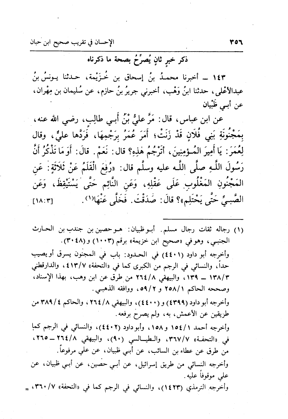 143 - أَخْبَرَنَا مُحَمَّدُ بْنُ إِسْحَاقَ بْنِ خُزَيْمَةَ حَدَّثَنَا يونس بن عبد الأعلى حدثنا بن وَهْبٍ أَخْبَرَنِي جَرِيرُ بْنُ حَازِمٍ عَنْ سُلَيْمَانَ بْنِ مِهْرَانَ عَنْ أَبِي ظَبْيَانَ عَنِ ابْنِ عَبَّاسٍ قَالَ: مَرَّ عَلِيُّ بْنُ أَبِي طَالِبٍ رضي الله تعالى عَنْهُ بِمَجْنُونَةِ بَنِي فُلَانٍ قَدْ زَنَتْ أَمَرَ عُمَرُ بِرَجْمِهَا فَرَدَّهَا عَلِيٌّ وَقَالَ لِعُمَرَ يَا أَمِيرَ الْمُؤْمِنِينَ أَتَرْجُمُ هَذِهِ قَالَ: نَعَمْ قَالَ: أو ما تَذْكُرُ أَنَّ رَسُولَ اللَّهِ صَلَّى اللَّهُ عَلَيْهِ وَسَلَّمَ قَالَ: "رُفِعَ الْقَلَمُ عَنْ ثَلَاثَةٍ عَنِ الْمَجْنُونِ الْمَغْلُوبِ عَلَى عَقْلِهِ وَعَنِ النَّائِمِ حَتَّى يَسْتَيْقِظَ وَعَنِ الصَّبِيِّ حَتَّى يَحْتَلِمَ" قَالَ صَدَقْتَ فخلى عنها1. [18:3]