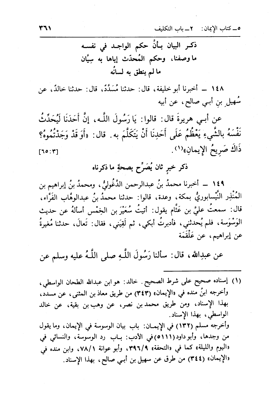 148 - أَخْبَرَنَا أَبُو خَلِيفَةَ قَالَ حَدَّثَنَا مُسَدَّدٌ قَالَ حَدَّثَنَا خَالِدٌ عَنْ سُهَيْلِ بْنِ أَبِي صَالِحٍ عَنْ أَبِيهِ عَنْ أَبِي هُرَيْرَةَ قَالَ: قَالُوا: يَا رَسُولَ اللَّهِ إِنَّ أَحَدَنَا لَيُحَدِّثُ نَفْسَهُ بِالشَّيْءِ يَعْظُمُ عَلَى أَحَدِنَا أَنْ يَتَكَلَّمَ بِهِ قَالَ: "أَوَقَدْ وجدتموه؟ ذاك صريح الإيمان"1. [65:3]