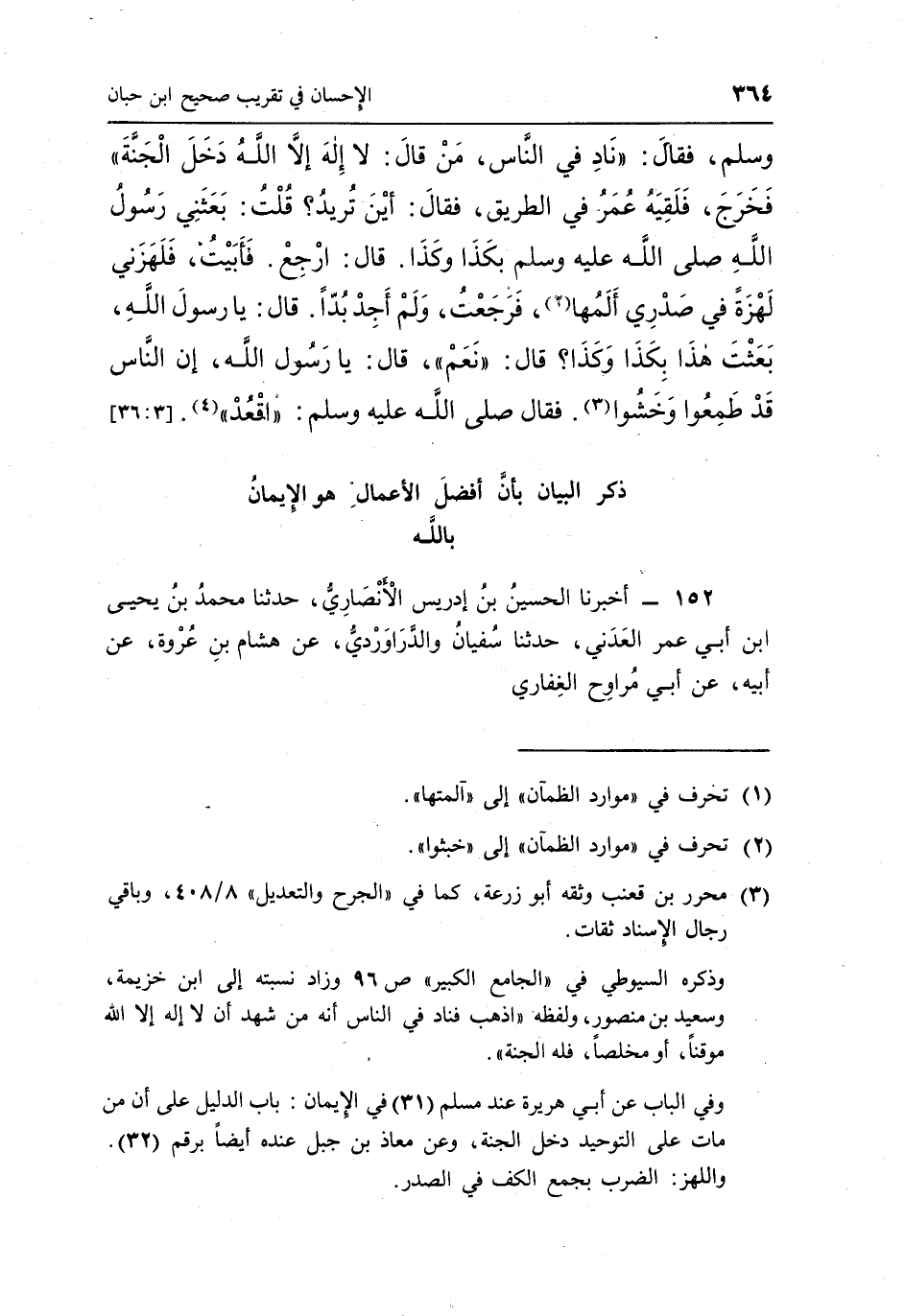 وَسَلَّمَ فَقَالَ: "نَادِ فِي النَّاسِ مَنْ قَالَ: لَا إِلَهَ إِلَّا اللَّهُ دَخَلَ الْجَنَّةَ" فَخَرَجَ فَلَقِيَهُ عُمَرُ فِي الطَّرِيقِ فَقَالَ: أَيْنَ تُرِيدُ؟ قُلْتُ: بَعَثَنِي رَسُولُ اللَّهِ صَلَّى اللَّهُ عَلَيْهِ وَسَلَّمَ بِكَذَا وَكَذَا قَالَ: ارْجِعْ, فَأَبَيْتُ فَلَهَزَنِي لَهْزَةً فِي صَدْرِي أَلَمُهَا1 فَرَجَعْتُ وَلَمْ أَجِدْ بُدًّا قَالَ: يَا رَسُولَ اللَّهِ بَعَثْتَ هَذَا بِكَذَا وَكَذَا قَالَ: "نَعَمْ" قَالَ: يَا رَسُولَ اللَّهِ إِنَّ النَّاسَ قَدْ طَمِعُوا وَخَشُوا2 فَقَالَ صلى الله عليه وسلم: "أقعد"3. [36:3]