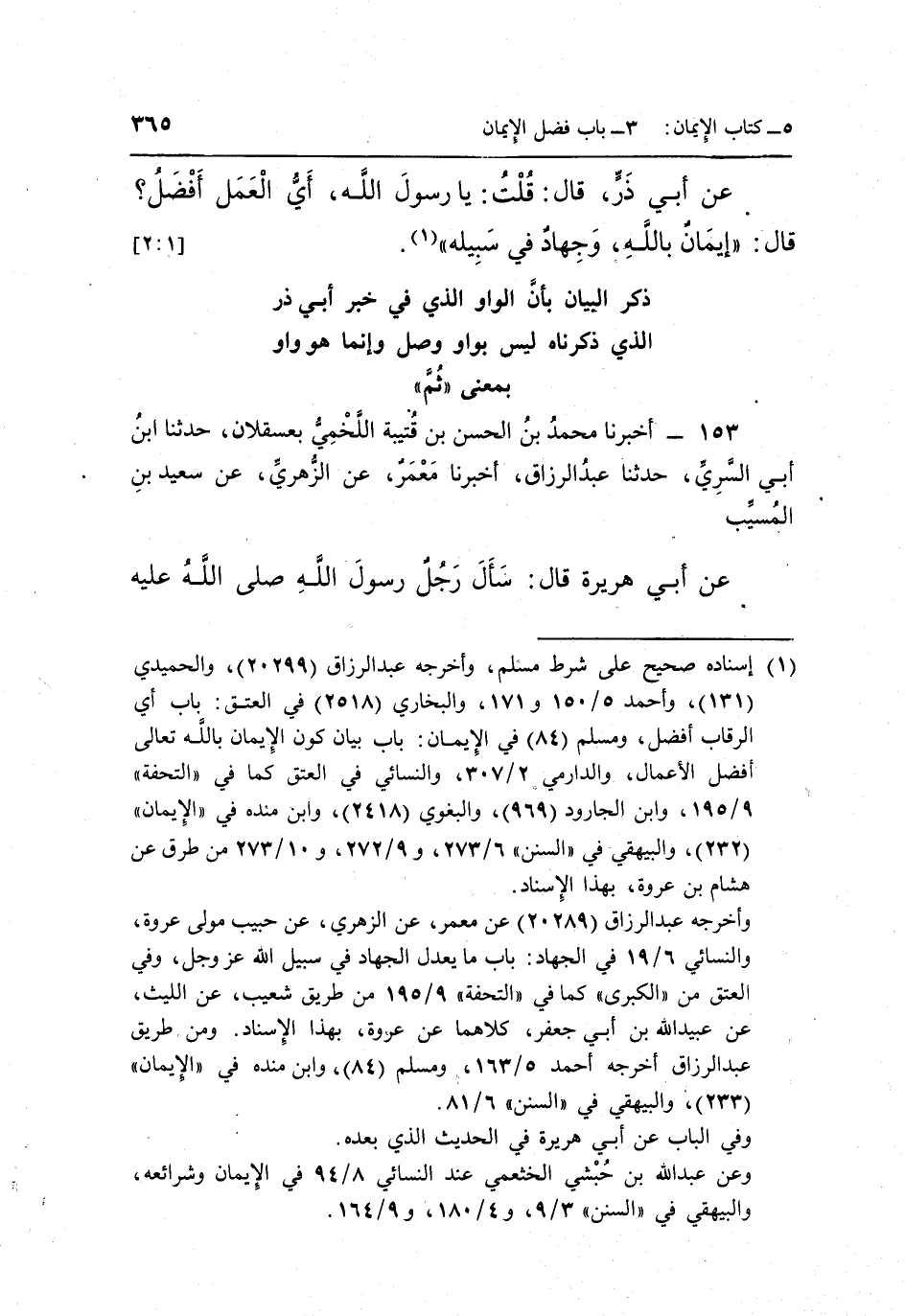152 - أَخْبَرَنَا الْحُسَيْنُ بْنُ إِدْرِيسَ الْأَنْصَارِيُّ حَدَّثَنَا مُحَمَّدُ بْنُ يَحْيَى بْنِ أَبِي عُمَرَ الْعَدَنِيُّ حدثنا سفيان والداروردي عَنْ هِشَامِ بْنِ عُرْوَةَ عَنْ أَبِيهِ عَنْ أَبِي مُرَاوِحٍ الْغِفَارِيِّ عَنْ أَبِي ذَرٍّ قَالَ: قُلْتُ: يَا رَسُولَ اللَّهِ أَيُّ الْعَمَلِ أَفْضَلُ؟ قَالَ: "إِيمَانٌ بِاللَّهِ وجهاد في سبيله"1. [2:1]