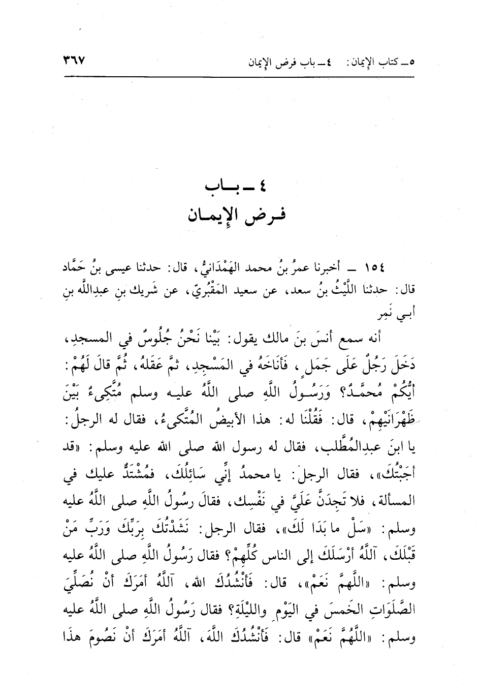 154 - أَخْبَرَنَا عُمَرُ بْنُ مُحَمَّدٍ الْهَمْدَانِيُّ قَالَ حَدَّثَنَا عِيسَى بْنُ حَمَّادٍ قَالَ حَدَّثَنَا اللَّيْثُ بْنُ سَعْدٍ عَنْ سَعِيدٍ الْمَقْبُرِيِّ عَنْ شَرِيكِ بْنِ عَبْدِ اللَّهِ بْنِ أَبِي نَمِرٍ أَنَّهُ سَمِعَ أَنَسَ بْنَ مَالِكٍ يَقُولُ: بَيْنَا نَحْنُ جُلُوسٌ فِي الْمَسْجِدِ دَخَلَ رَجُلٌ عَلَى جَمَلٍ فَأَنَاخَهُ فِي الْمَسْجِدِ ثُمَّ عَقَلَهُ ثُمَّ قَالَ لَهُمْ: أَيُّكُمْ مُحَمَّدٌ؟ وَرَسُولُ اللَّهِ صَلَّى اللَّهُ عَلَيْهِ وَسَلَّمَ مُتَّكِئٌ بَيْنَ ظَهْرَانَيْهِمْ قال: فقلنا له: هذا الأبيض المتكىء, فَقَالَ لَهُ الرَّجُلُ: يَا ابْنَ عَبْدِ الْمُطَّلِبِ فَقَالَ لَهُ رَسُولُ اللَّهِ صَلَّى اللَّهُ عَلَيْهِ وَسَلَّمَ: "قَدْ أَجَبْتُكَ" فَقَالَ الرَّجُلُ: يَا مُحَمَّدُ إِنِّي سَائِلُكَ فَمُشْتَدٌّ عَلَيْكَ فِي الْمَسْأَلَةِ فَلَا تَجِدَنَّ عَلَيَّ فِي نَفْسِكَ فَقَالَ رَسُولُ اللَّهِ صَلَّى اللَّهُ عَلَيْهِ وَسَلَّمَ: "سَلْ مَا بَدَا لَكَ" فَقَالَ الرَّجُلُ: نَشَدْتُكَ بِرَبِّكَ وَرَبِّ مَنْ قَبْلَكَ آللَّهُ أَرْسَلَكَ إِلَى النَّاسِ كُلِّهِمْ؟ فَقَالَ رَسُولُ اللَّهِ صَلَّى اللَّهُ عَلَيْهِ وَسَلَّمَ: "اللَّهُمَّ نعم" قال: فأنشدك الله آلله أمرك أن نُصَلِّيَ الصَّلَوَاتِ الْخَمْسَ فِي الْيَوْمِ وَاللَّيْلَةِ؟ فَقَالَ رَسُولُ اللَّهِ صَلَّى اللَّهُ عَلَيْهِ وَسَلَّمَ: "اللَّهُمَّ نعم" قال: فأنشدك الله آلله أمرك أن نصوم هذاباب فرض الإيمان