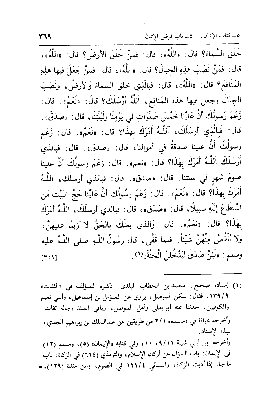 خَلَقَ السَّمَاءَ قَالَ: "اللَّهُ" قَالَ: فَمَنْ خَلَقَ الْأَرْضَ قَالَ: "اللَّهُ" قَالَ: فَمَنْ نَصَبَ هَذِهِ الْجِبَالَ قَالَ: "اللَّهُ" قَالَ: فَمَنْ جَعَلَ فِيهَا هَذِهِ الْمَنَافِعَ قَالَ: "اللَّهُ" قَالَ: فَبِالَّذِي خَلَقَ السَّمَاءَ وَالْأَرْضَ وَنَصَبَ الْجِبَالَ وَجَعَلَ فِيهَا هَذِهِ الْمَنَافِعَ آللَّهُ أَرْسَلَكَ؟ قَالَ: "نَعَمْ" قَالَ: زَعَمَ رَسُولُكَ أَنَّ عَلَيْنَا خَمْسَ صَلَوَاتٍ فِي يَوْمِنَا وَلَيْلَتِنَا قَالَ: "صَدَقَ" قَالَ: فَبِالَّذِي أَرْسَلَكَ آللَّهُ أَمَرَكَ بِهَذَا؟ قَالَ: "نَعَمْ" قَالَ: زَعَمَ رَسُولُكَ أَنَّ عَلَيْنَا صَدَقَةً فِي أَمْوَالِنَا قَالَ: "صَدَقَ" قَالَ: فَبِالَّذِي أَرْسَلَكَ آللَّهُ أَمَرَكَ بِهَذَا؟ قَالَ: "نَعَمْ" قَالَ: زَعَمَ رَسُولُكَ أَنَّ عَلَيْنَا صَوْمَ شَهْرٍ فِي سَنَتِنَا قَالَ: "صَدَقَ" قَالَ: فَبِالَّذِي أَرْسَلَكَ آللَّهُ أَمَرَكَ بِهَذَا؟ قَالَ: نَعَمْ قَالَ: زَعَمَ رَسُولُكَ أَنَّ عَلَيْنَا حَجَّ الْبَيْتِ مَنِ اسْتَطَاعَ إِلَيْهِ سَبِيلًا قَالَ: "صَدَقَ" قَالَ: فَبِالَّذِي أَرْسَلَكَ آللَّهُ أَمَرَكَ بِهَذَا؟ قَالَ: "نَعَمْ", قَالَ: وَالَّذِي بَعَثَكَ بِالْحَقِّ لَا أَزِيدُ عَلَيْهِنَّ وَلَا أَنْقُصُ مِنْهُنَّ شَيْئًا فَلَمَّا قَفَّى قَالَ رَسُولُ اللَّهِ صَلَّى اللَّهُ عَلَيْهِ وَسَلَّمَ: "لَئِنْ صَدَقَ ليدخلن الجنة"1. [3:1]