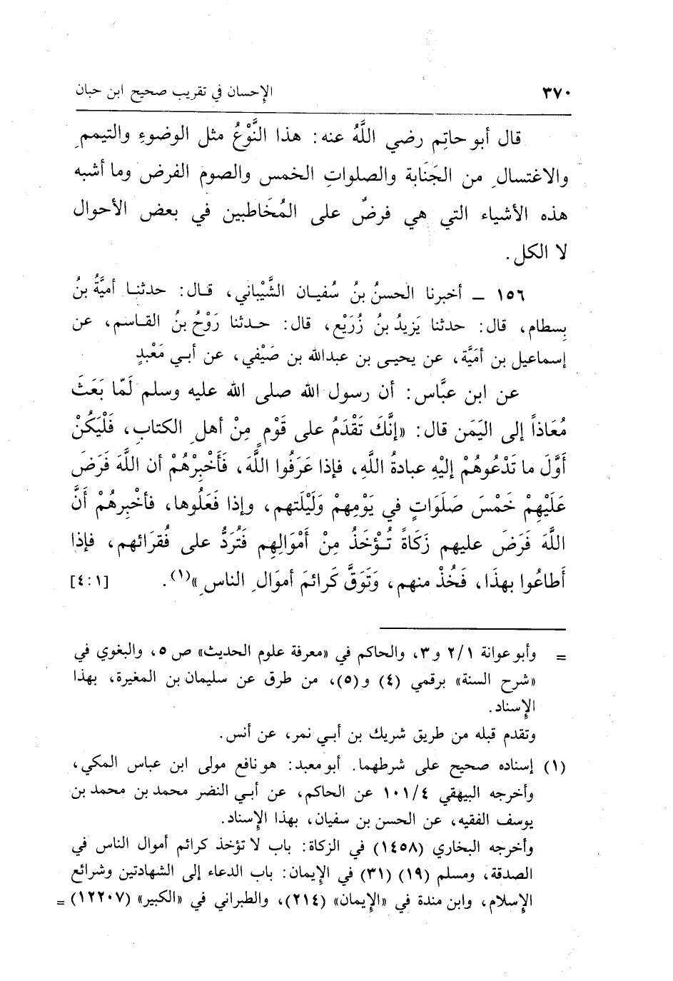 156 - أَخْبَرَنَا الْحَسَنُ بْنُ سُفْيَانَ الشَّيْبَانِيُّ قَالَ حَدَّثَنَا أُمَيَّةُ بْنُ بِسْطَامٍ قَالَ حَدَّثَنَا يَزِيدُ بْنُ زُرَيْعٍ قَالَ حَدَّثَنَا رَوْحُ بْنُ الْقَاسِمِ عَنْ إِسْمَاعِيلَ بْنِ أُمَيَّةَ عَنْ يَحْيَى بْنِ عَبْدِ اللَّهِ بْنِ صَيْفِيٍّ عَنْ أَبِي مَعْبَدٍ عَنِ ابْنِ عَبَّاسٍ أَنَّ رَسُولَ اللَّهِ صَلَّى اللَّهُ عَلَيْهِ وَسَلَّمَ لَمَّا بَعَثَ مُعَاذًا إِلَى الْيَمَنِ قَالَ: "إِنَّكَ تَقَدُمُ عَلَى قَوْمٍ مِنْ أَهْلِ الْكِتَابِ فَلْيَكُنْ أَوَّلَ مَا تَدْعُوهُمْ إِلَيْهِ عِبَادَةُ اللَّهِ فَإِذَا عَرَفُوا اللَّهَ فَأَخْبِرْهُمْ أَنَّ اللَّهَ فَرَضَ عَلَيْهِمْ خَمْسَ صَلَوَاتٍ فِي يَوْمِهِمْ وَلَيْلَتِهِمْ وَإِذَا فَعَلُوهَا فَأَخْبِرْهُمْ أَنَّ اللَّهَ فَرَضَ عَلَيْهِمْ زَكَاةً تُؤْخَذُ مِنْ أَمْوَالِهِمْ فَتُرَدُّ عَلَى فُقَرَائِهِمْ فَإِذَا أَطَاعُوا بِهَذَا فَخُذْ مِنْهُمْ وَتَوَقَّ كَرَائِمَ أموال الناس"1. [4:1]