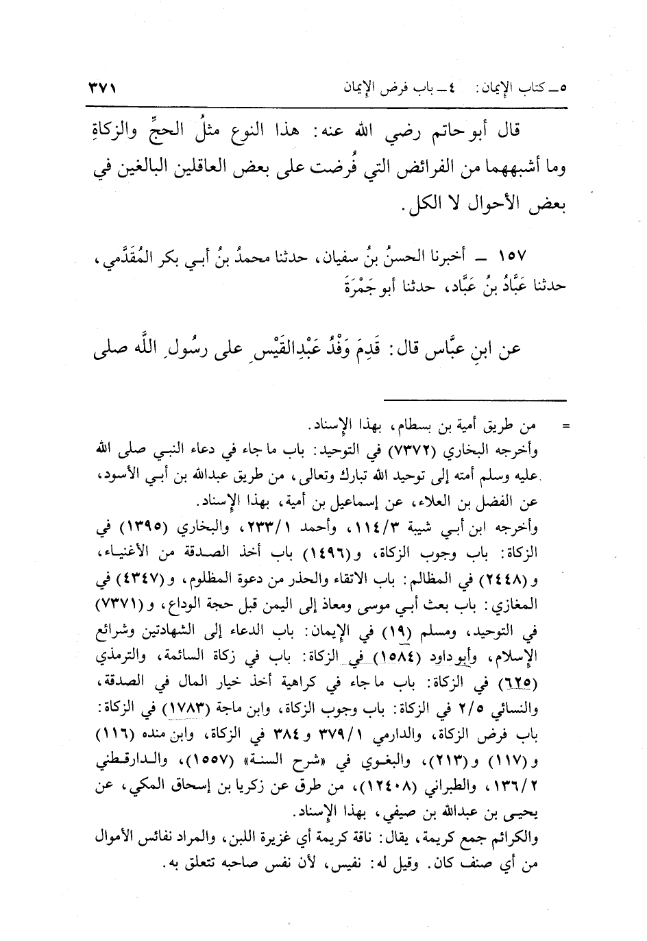 157 - أَخْبَرَنَا الْحَسَنُ بْنُ سُفْيَانَ حَدَّثَنَا مُحَمَّدُ بْنُ أَبِي بَكْرٍ الْمُقَدَّمِيُّ حَدَّثَنَا عَبَّادُ بْنُ عَبَّادٍ حدثنا أبو جمرة عن بن عَبَّاسٍ قَالَ: قَدِمَ وَفْدُ عَبْدِ الْقَيْسِ عَلَى رسول الله صلىقال أبو حاتم رضي الله تعالى عَنْهُ: هَذَا النَّوْعُ مِثْلُ الْحَجِّ وَالزَّكَاةِ وَمَا أَشْبَهَهُمَا مِنَ الْفَرَائِضِ الَّتِي فُرِضَتْ عَلَى بَعْضِ الْعَاقِلِينَ الْبَالِغِينَ فِي بَعْضِ الْأَحْوَالِ لَا الْكُلِّ.
