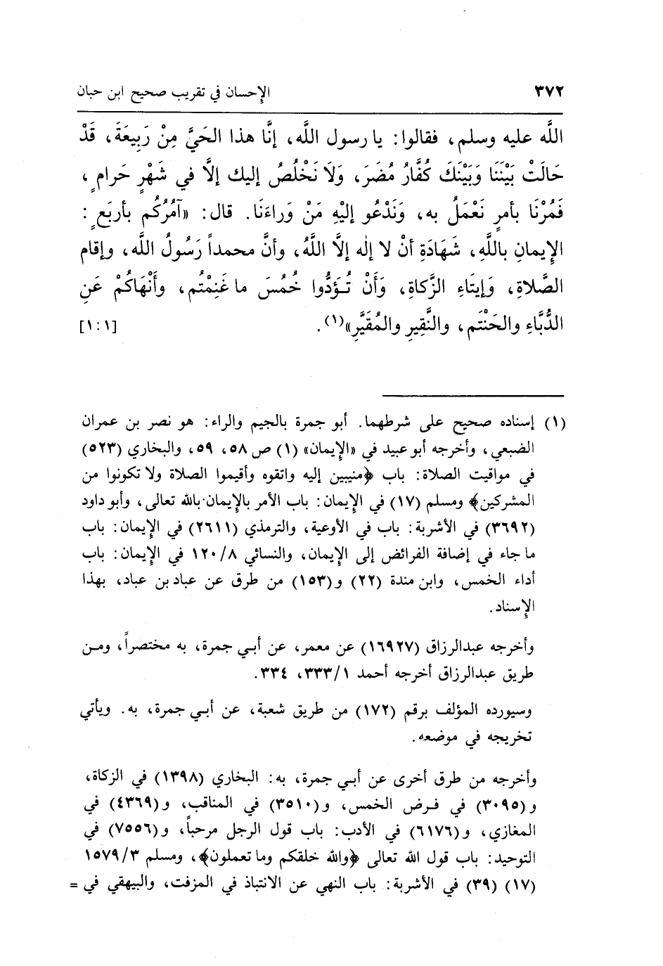 1 إسناده صحيح على شرطهما، أبو جمرة بالجيم والراء: هو نصر بن عمران الضبعي، وأخرجه أبو عبيد في "الإيمان" "1" ص58، 59، والبخاري "523" في مواقيت الصلاة: باب {مُنِيبِينَ إِلَيْهِ وَاتَّقُوهُ وَأَقِيمُوا الصَّلاةَ وَلا تَكُونُوا مِنَ الْمُشْرِكِينَ} ، ومسلم "17" في الإيمان: باب الأمر بالإيمان بالله تعالى، وأبو داود "3692" في الأشربة: باب في الأوعية، والترمذي "2611" في الإيمان: باب ما جاء في إضافة الفرائض إلى الإيمان، والنسائي 8/120 في الإيمان: باب أداء الخمس، وابن مندة "22" و"153" من طرق عن عباد بن عباد، بهذا الإسناد.