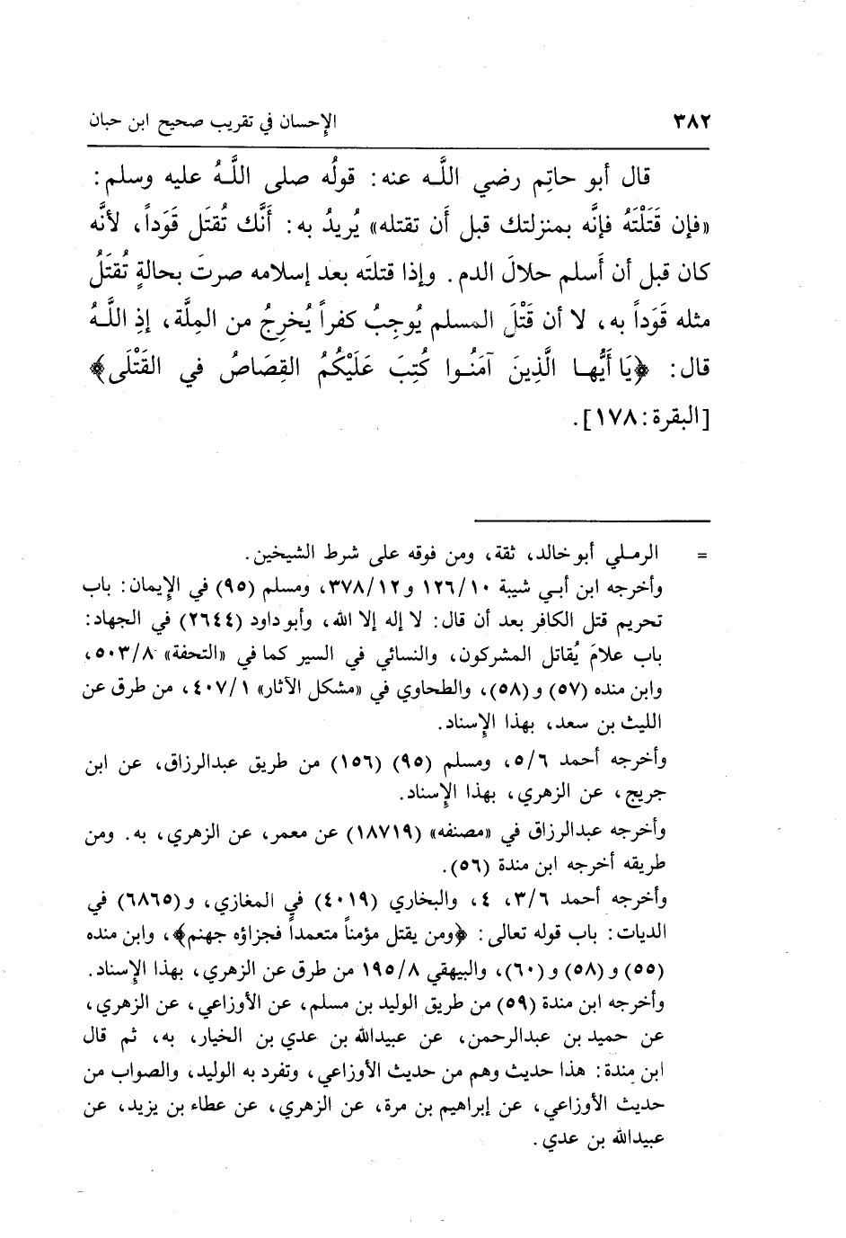 قال أبو حاتم رضي الله تعالى عَنْهُ: قَوْلُهُ صَلَّى اللَّهُ عَلَيْهِ وَسَلَّمَ: "فَإِنْ قتلته بِمَنْزِلَتِكَ قَبْلَ أَنْ تَقْتُلَهُ" يُرِيدُ بِهِ أَنَّكَ تُقْتَلُ قَوَدًا لِأَنَّهُ كَانَ قَبْلَ أَنْ أَسْلَمَ حَلَالَ الدَّمِ وَإِذَا قَتَلْتَهُ بَعْدَ إِسْلَامِهِ صِرْتَ بِحَالَةٍ تُقْتَلُ مِثْلَهُ قَوَدًا بِهِ لَا أَنَّ قَتْلَ الْمُسْلِمِ يُوجِبُ كُفْرًا يُخْرِجُ مِنَ الْمِلَّةِ إِذِ اللَّهُ قَالَ: {يَا أَيُّهَا الَّذِينَ آمَنُوا كُتِبَ عَلَيْكُمُ الْقِصَاصُ فِي الْقَتْلَى} [البقرة: 178] .
