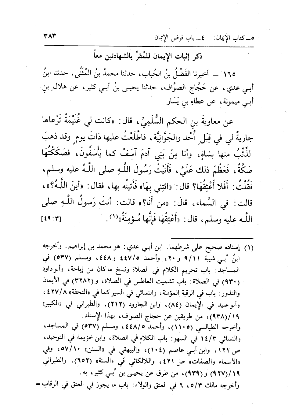 165 - أَخْبَرَنَا الْفَضْلُ بْنُ الْحُبَابِ حَدَّثَنَا مُحَمَّدُ بْنُ الْمُثَنَّى حدثنا بن أَبِي عَدِيٍّ عَنْ حَجَّاجٍ الصَّوَّافِ حَدَّثَنَا يَحْيَى بْنُ أَبِي كَثِيرٍ عَنْ هِلَالِ بْنِ أَبِي مَيْمُونَةَ عَنْ عَطَاءِ بْنِ يَسَارٍ عَنْ مُعَاوِيَةَ بْنِ الْحَكَمِ السُّلَمِيِّ قَالَ: كَانَتْ لِي غُنَيْمَةٌ تَرْعَاهَا جَارِيَةٌ لِي فِي قِبَلِ أُحُدٍ وَالْجَوَّانِيَّةِ فَاطَّلَعْتُ عَلَيْهَا ذَاتَ يَوْمٍ وَقَدْ ذَهَبَ الذِّئْبُ مِنْهَا بِشَاةٍ وَأَنَا مِنْ بَنِي آدَمَ آسَفُ كَمَا يَأْسَفُونَ فَصَكَكْتُهَا صَكَّةً فَعَظُمَ ذَلِكَ عَلَيَّ فَأَتَيْتُ رَسُولَ اللَّهِ صَلَّى اللَّهُ عَلَيْهِ وَسَلَّمَ فَقُلْتُ: أَفَلَا أَعْتِقُهَا؟ قَالَ: "ائْتِنِي بِهَا" فَأَتَيْتُهُ بِهَا فَقَالَ: "أَيْنَ اللَّهُ؟ " قَالَتْ: فِي السَّمَاءِ قَالَ: "مَنْ أَنَا؟ " قَالَتْ: أَنْتَ رَسُولُ اللَّهِ صَلَّى اللَّهُ عَلَيْهِ وَسَلَّمَ قَالَ: "أَعْتِقْهَا فَإِنَّهَا مؤمنة"1. [49:3]