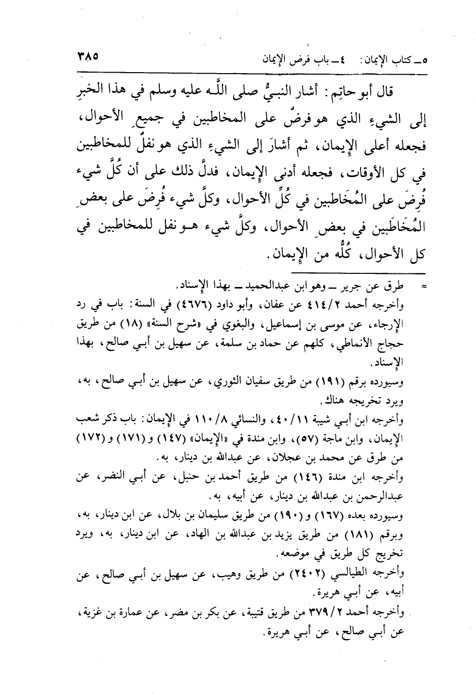 قَالَ أَبُو حَاتِمٍ: أَشَارَ النَّبِيُّ صَلَّى اللَّهُ عَلَيْهِ وَسَلَّمَ فِي هَذَا الْخَبَرِ إِلَى الشيء الذي هو فرض على المخاطبين في جَمِيعِ الْأَحْوَالِ فَجَعَلَهُ أَعْلَى الْإِيمَانِ ثُمَّ أَشَارَ إِلَى الشَّيْءِ الَّذِي هُوَ نَفْلٌ لِلْمُخَاطَبِينَ فِي كُلِّ الْأَوْقَاتِ فَجَعَلَهُ أَدْنَى الْإِيمَانِ فَدَلَّ ذَلِكَ عَلَى أَنَّ كُلَّ شَيْءٍ فَرْضٌ عَلَى الْمُخَاطَبِينَ فِي كُلِّ الْأَحْوَالِ وَكُلَّ شَيْءٍ فَرْضٌ عَلَى بَعْضِ الْمُخَاطَبِينَ فِي بَعْضِ الْأَحْوَالِ وَكُلَّ شَيْءٍ هُوَ نَفْلٌ لِلْمُخَاطَبِينَ فِي كُلِّ الْأَحْوَالِ كُلُّهُ من الإيمان.