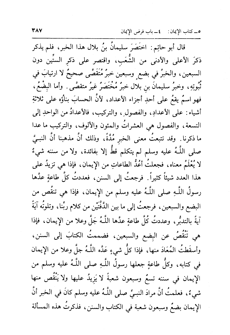 قَالَ أَبُو حَاتِمٍ اخْتَصَرَ سُلَيْمَانُ بْنُ بِلَالٍ هَذَا الْخَبَرَ فَلَمْ يَذْكُرْ ذِكْرَ الْأَعْلَى وَالْأَدْنَى مِنَ الشُّعَبِ وَاقْتَصَرَ عَلَى ذِكْرِ السِّتِّينَ دُونَ السَّبْعِينَ وَالْخَبَرُ فِي بِضْعٍ وَسَبْعِينَ خَبَرٌ مُتَقَصًّى صَحِيحٌ لَا ارْتِيَابَ فِي ثُبُوتِهِ وَخَبَرُ سُلَيْمَانَ بْنِ بِلَالٍ خَبَرٌ مُخْتَصَرٌ غَيْرُ مُتَقَصًّى وَأَمَّا الْبِضْعُ فَهُوَ اسْمٌ يَقَعُ عَلَى أَحَدِ أَجْزَاءِ الْأَعْدَادِ لِأَنَّ الْحِسَابَ بِنَاؤُهُ عَلَى ثَلَاثَةِ أَشْيَاءَ عَلَى الْأَعْدَادِ وَالْفُصُولِ وَالتَّرْكِيبِ فَالْأَعْدَادُ مِنَ الْوَاحِدِ إِلَى التِّسْعَةِ وَالْفُصُولُ هِيَ الْعَشَرَاتُ وَالْمِئُونُ وَالْأُلُوفُ وَالتَّرْكِيبُ مَا عَدَا مَا ذَكَرْنَا وَقَدْ تَتَبَّعْتُ مَعْنَى الْخَبَرِ مُدَّةً وَذَلِكَ أَنَّ مَذْهَبَنَا أَنَّ النَّبِيَّ صَلَّى اللَّهُ عَلَيْهِ وَسَلَّمَ لَمْ يَتَكَلَّمْ قَطُّ إِلَّا بِفَائِدَةٍ وَلَا مِنْ سُنَنِهِ شَيْءٌ لَا يُعْلَمُ مَعْنَاهُ فَجَعَلْتُ أَعُدُّ الطَّاعَاتِ مِنَ الْإِيمَانِ فَإِذَا هِيَ تَزِيدُ عَلَى هَذَا الْعَدَدِ شَيْئًا كَثِيرًا فَرَجَعْتُ إِلَى السُّنَنِ فَعَدَدْتُ كُلَّ طَاعَةٍ عَدَّهَا رَسُولُ اللَّهِ صَلَّى اللَّهُ عَلَيْهِ وَسَلَّمَ مِنَ الْإِيمَانِ فَإِذَا هِيَ تَنْقُصُ مِنَ الْبِضْعِ وَالسَّبْعِينَ فَرَجَعْتُ إِلَى مَا بَيْنَ الدَّفَّتَيْنِ مِنْ كَلَامِ رَبِّنَا وَتَلَوْتُهُ آيَةً آيَةً بِالتَّدَبُّرِ وَعَدَدْتُ كُلَّ طَاعَةٍ عَدَّهَا اللَّهُ جَلَّ وَعَلَا مِنَ الْإِيمَانِ فَإِذَا هِيَ تَنْقُصُ عَنِ الْبِضْعِ وَالسَّبْعِينَ فَضَمَمْتُ الْكِتَابَ إِلَى السُّنَنِ وَأَسْقَطْتُ الْمُعَادَ مِنْهَا فَإِذَا كُلُّ شَيْءٍ عَدَّهُ اللَّهُ جَلَّ وَعَلَا مِنَ الْإِيمَانِ فِي كِتَابِهِ وَكُلُّ طَاعَةٍ جَعَلَهَا رَسُولُ اللَّهِ صَلَّى اللَّهُ عَلَيْهِ وَسَلَّمَ مِنَ الْإِيمَانِ فِي سُنَنِهِ تِسْعٌ وَسَبْعُونَ شُعْبَةً لَا يَزِيدُ عَلَيْهَا وَلَا يَنْقُصُ مِنْهَا شَيْءٌ فَعَلِمْتُ أَنَّ مُرَادَ النَّبِيِّ صَلَّى اللَّهُ عَلَيْهِ وَسَلَّمَ كَانَ فِي الْخَبَرِ أَنَّ الْإِيمَانَ بِضْعٌ وَسَبْعُونَ شُعْبَةً فِي الْكِتَابِ وَالسُّنَنِ فَذَكَرْتُ هَذِهِ المسألة