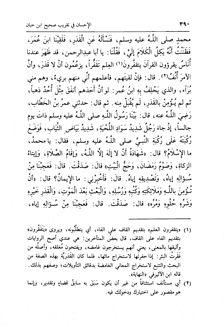 168 - أَخْبَرَنَا الْحَسَنُ بْنُ سُفْيَانَ حَدَّثَنَا مُحَمَّدُ بْنُ الْمِنْهَالِ الضَّرِيرُ حَدَّثَنَا يَزِيدُ بْنُ زُرَيْعٍ حَدَّثَنَا كَهْمَسُ بْنُ الْحَسَنِ عَنْ عَبْدِ اللَّهِ بْنِ بُرَيْدَةَ عَنْ يَحْيَى بْنِ يَعْمَرَ قَالَ خَرَجْتُ أَنَا وَحُمَيْدُ بْنُ عَبْدِ الرَّحْمَنِ الْحِمْيَرِيُّ حَاجَّيْنِ أَوْ مُعْتَمِرَيْنِ وَقُلْنَا لَعَلَّنَا لَقِينَا رَجُلًا مِنْ أَصْحَابِ مُحَمَّدٍ صَلَّى اللَّهُ عَلَيْهِ وَسَلَّمَ فنسأله عن القدر فلقينا بن عُمَرَ فَظَنَنْتُ أَنَّهُ يَكِلُ الْكَلَامَ إِلَيَّ فَقُلْنَا: يَا أَبَا عَبْدِ الرَّحْمَنِ قَدْ ظَهَرَ عِنْدَنَا أناس يقرؤون الْقُرْآنَ يَتَقَفَّرُونَ1 الْعِلْمَ تَقَفُّرًا يَزْعُمُونَ أَنْ لَا قَدَرَ وَأَنَّ الْأَمْرَ أُنُفٌ2 قَالَ: فَإِنْ لَقِيتَهُمْ فَأَعْلِمْهُمْ أَنِّي مِنْهُمْ بَرِيءٌ وَهُمْ مِنِّي بُرَآءُ والذي يحلف به بن عُمَرَ لَوْ أَنَّ أَحَدَهُمْ أَنْفَقَ مِثْلَ أُحُدٍ ذَهَبًا ثُمَّ لَمْ يُؤْمِنْ بِالْقَدَرِ لَمْ يُقْبَلْ مِنْهُ ثُمَّ قَالَ: حَدَّثَنِي عُمَرُ بْنُ الْخَطَّابِ رضي الله تعالى عَنْهُ قَالَ: بَيْنَا رَسُولُ اللَّهِ صَلَّى اللَّهُ عَلَيْهِ وَسَلَّمَ ذَاتَ يَوْمٍ جَالِسًا إِذْ جَاءَ شَدِيدُ سَوَادِ اللِّحْيَةِ شَدِيدُ بَيَاضِ الثِّيَابِ فَوَضَعَ رُكْبَتَهُ عَلَى رُكْبَةِ النَّبِيِّ صَلَّى اللَّهُ عَلَيْهِ وَسَلَّمَ فَقَالَ يَا مُحَمَّدُ مَا الْإِسْلَامُ قَالَ: "شَهَادَةِ أَنْ لَا إِلَهَ إِلَّا اللَّهُ وَإِقَامِ الصَّلَاةِ وَإِيتَاءُ الزَّكَاةِ وَصَوْمُ رَمَضَانَ وَحَجُّ الْبَيْتِ" قَالَ: صَدَقْتَ فَعَجِبْنَا مِنْ سُؤَالِهِ إِيَّاهُ وَتَصْدِيقِهِ إِيَّاهُ قَالَ: فَأَخْبِرْنِي مَا الْإِيمَانُ؟ قَالَ: "أَنْ تؤمن بالله وملائكته وكتبه ورسله وَالْبَعْثِ بَعْدَ الْمَوْتِ وَالْقَدَرِ خَيْرِهِ وَشَرِّهِ حُلْوِهِ وَمُرِّهِ" قَالَ: صَدَقْتَ قَالَ: فَعَجِبْنَا مِنْ سُؤَالِهِ إياه
