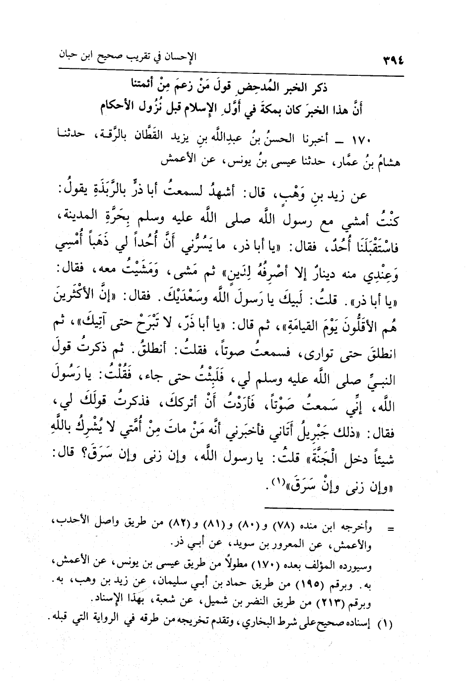 170 - أَخْبَرَنَا الْحُسَيْنُ بْنُ عَبْدِ اللَّهِ بْنِ يَزِيدَ الْقَطَّانُ بِالرَّقَّةِ حَدَّثَنَا هِشَامُ بْنُ عَمَّارٍ حَدَّثَنَا عِيسَى بْنُ يُونُسَ عَنِ الْأَعْمَشِ عَنْ زَيْدِ بْنِ وَهْبٍ قَالَ: أَشْهَدُ لَسَمِعْتُ أَبَا ذَرٍّ بِالرَّبَذَةِ يَقُولُ: كُنْتُ أَمْشِي مَعَ رَسُولِ اللَّهِ صَلَّى اللَّهُ عَلَيْهِ وَسَلَّمَ بِحَرَّةِ الْمَدِينَةِ فَاسْتَقْبَلَنَا أُحُدٌ فَقَالَ: "يَا أَبَا ذَرٍّ مَا يَسُرُّنِي أَنَّ أُحُدًا لِي ذَهَبًا أُمْسِي وَعِنْدِي مِنْهُ دِينَارٌ إِلَّا أَصْرِفُهُ لِدَيْنٍ", ثُمَّ مَشَى وَمَشَيْتُ مَعَهُ فَقَالَ: "يَا أَبَا ذَرٍّ", قُلْتُ: لَبَّيْكَ يَا رَسُولَ اللَّهِ وَسَعْدَيْكَ فَقَالَ: "إِنَّ الْأَكْثَرِينَ هُمُ الْأَقَلُّونَ يَوْمَ الْقِيَامَةِ" ثُمَّ قَالَ: "يَا أَبَا ذَرٍّ لَا تَبْرَحْ حَتَّى آتِيَكَ؟ " ثُمَّ انْطَلَقَ حَتَّى تَوَارَى فَسَمِعْتُ صَوْتًا فَقُلْتُ أَنْطَلِقُ ثُمَّ ذَكَرْتُ قَوْلَ النَّبِيِّ صَلَّى اللَّهُ عَلَيْهِ وَسَلَّمَ لِي فَلَبِثْتُ حَتَّى جَاءَ فَقُلْتُ يَا رَسُولَ اللَّهِ إِنِّي سَمِعْتُ صَوْتًا فَأَرَدْتُ أَنْ أُدْرِكَكَ فَذَكَرْتُ قَوْلَكَ لِي فَقَالَ: "ذَلِكَ جِبْرِيلُ أَتَانِي فَأَخْبَرَنِي أَنَّهُ مَنْ مَاتَ مِنْ أُمَّتِي لَا يُشْرِكُ بِاللَّهِ شَيْئًا دَخَلَ الْجَنَّةَ" قُلْتُ: يَا رَسُولَ اللَّهِ وَإِنْ زَنَى وَإِنْ سَرَقَ؟ قَالَ: "وَإِنْ زنى وإن سرق"1.