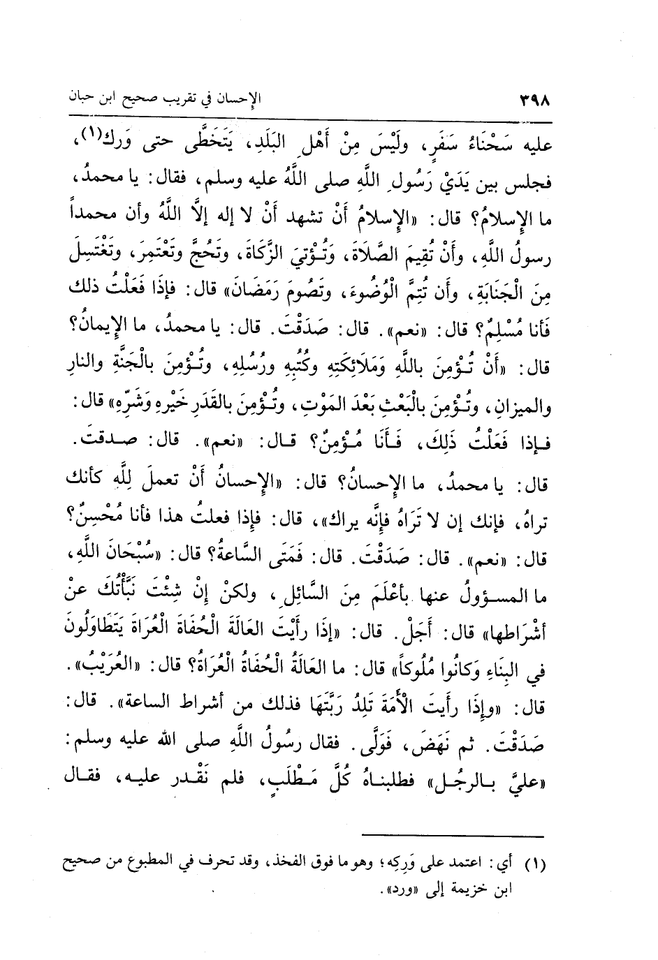 لَيْسَ عَلَيْهِ سَحْنَاءُ سَفَرٍ وَلَيْسَ مِنْ أَهْلِ الْبَلَدِ يَتَخَطَّى حَتَّى وَرَكَ1 فَجَلَسَ بَيْنَ يَدَيْ رَسُولِ اللَّهِ صَلَّى اللَّهُ عَلَيْهِ وسلم فقال: يَا مُحَمَّدُ مَا الْإِسْلَامُ؟ قَالَ: "الْإِسْلَامُ أَنْ تَشْهَدَ أَنْ لَا إِلَهَ إِلَّا اللَّهُ وَأَنَّ محمد رَسُولُ اللَّهِ وَأَنْ تُقِيمَ الصَّلَاةَ وَتُؤْتِيَ الزَّكَاةَ وَتَحُجَّ وَتَعْتَمِرَ وَتَغْتَسِلَ مِنَ الْجَنَابَةِ وَأَنْ تُتِمَّ الْوُضُوءَ وَتَصُومَ رَمَضَانَ" قَالَ: فَإِذَا فَعَلْتُ ذَلِكَ فَأَنَا مُسْلِمٌ؟ قَالَ: "نَعَمْ" قَالَ: صَدَقْتَ قَالَ: يَا مُحَمَّدُ مَا الْإِيمَانُ؟ قَالَ: "أَنْ تُؤْمِنَ بِاللَّهِ وَمَلَائِكَتِهِ وَكُتُبِهِ وَرُسُلِهِ وَتُؤْمِنَ بِالْجَنَّةِ وَالنَّارِ وَالْمِيزَانِ وَتُؤْمِنَ بِالْبَعْثِ بَعْدَ الْمَوْتِ وَتُؤْمِنَ بِالْقَدَرِ خَيْرِهِ وَشَرِّهِ" قَالَ: فَإِذَا فَعَلْتُ ذَلِكَ فَأَنَا مُؤْمِنٌ؟ قَالَ: "نَعَمْ" قَالَ: صَدَقْتَ قَالَ: يَا مُحَمَّدُ مَا الْإِحْسَانُ؟ قَالَ: "الْإِحْسَانُ أَنْ تَعْمَلَ لِلَّهِ كَأَنَّكَ تَرَاهُ فَإِنَّكَ إِنْ لَا تَرَاهُ فَإِنَّهُ يَرَاكَ" قَالَ: فَإِذَا فَعَلْتُ هَذَا فَأَنَا مُحْسِنٌ؟ قَالَ: "نَعَمْ" قَالَ: صَدَقْتَ قَالَ: فَمَتَى السَّاعَةُ؟ قَالَ: "سُبْحَانَ اللَّهِ مَا الْمَسْؤُولُ عَنْهَا بِأَعْلَمَ مِنَ السَّائِلِ وَلَكِنْ إِنْ شِئْتَ نَبَّأْتُكَ عَنْ أَشْرَاطِهَا" قَالَ: أَجَلْ قَالَ: "إِذَا رَأَيْتَ الْعَالَةَ الْحُفَاةَ الْعُرَاةَ يَتَطَاوَلُونَ فِي الْبِنَاءِ وَكَانُوا مُلُوكًا" قَالَ: مَا الْعَالَةُ الْحُفَاةُ الْعُرَاةُ قَالَ: "الْعُرَيْبُ" قَالَ: "وَإِذَا رَأَيْتَ الْأَمَةَ تَلِدُ رَبَّتَهَا فَذَلِكَ مِنْ أَشْرَاطِ السَّاعَةِ" قَالَ: صَدَقْتَ ثُمَّ نَهَضَ فَوَلَّى فَقَالَ رَسُولُ اللَّهِ صَلَّى اللَّهُ عَلَيْهِ وَسَلَّمَ: "عَلَيَّ بِالرَّجُلِ" فَطَلَبْنَاهُ كُلَّ مَطْلَبٍ فلم نقدر عليه فقال