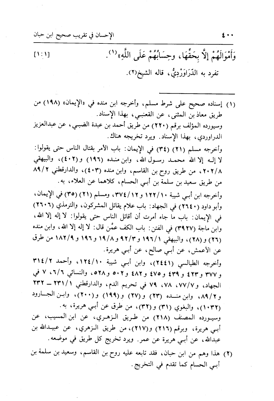 وأخرجه مسلم "21" "34" في الإيمان: باب الأمر بقتال النَّاسَ حَتَّى يَقُولُوا: لَا إِلَهَ إِلَّا اللَّهُ محمد رسول الله، وابن منده "196" و"402"، والبيهقي 8/202، من طريق روح بن القاسم، وابن منده "403"، والدارقطني 2/89، من طريق سعيد بن سلمة بن أبي الحسام، كلاهما عن العلاء، به.