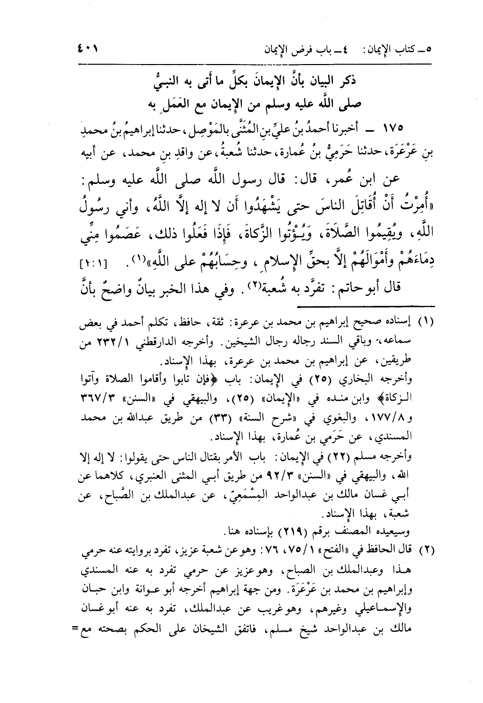2 قال الحافظ في "الفتح" 1/75-76: وهو عن شعبة عزيز، تفرد بروايته عنه حرمي هذا وعبد الملك، وهو عزيز عن حرمي تفرد به عنه المسندي وإبراهيم بن محمد بن عرعرة. ومن جهة إبراهيم أخرجه أبو عوانة وابن حبان والإسماعيلي وغيرهم، وهو غريب عن عبد الملك، تفرد به عنه أبو غسان مالك بن عبد الواحد شيخ مسلم، فاتفق الشيخان على الحكم بصحته مع غرابته، وليس هو في "مسند" أحمد على سعته، وقد استبعد قوم صحته بأن الحديث لو كان عند ابن عمر لما ترك أباه ينازع أبا بكر في قتال مانعي الزكاة والجواب أنه لا يلزم من كون الحديث المذكور عند ابن عمر أن يكون استحضره في تلك الحالة، ولو كان مستحضراً له فقد يحتمل أن لا يكون حضر المناظرة المذكورة ... إلى آخر ما قاله الحافظ فانظره.
