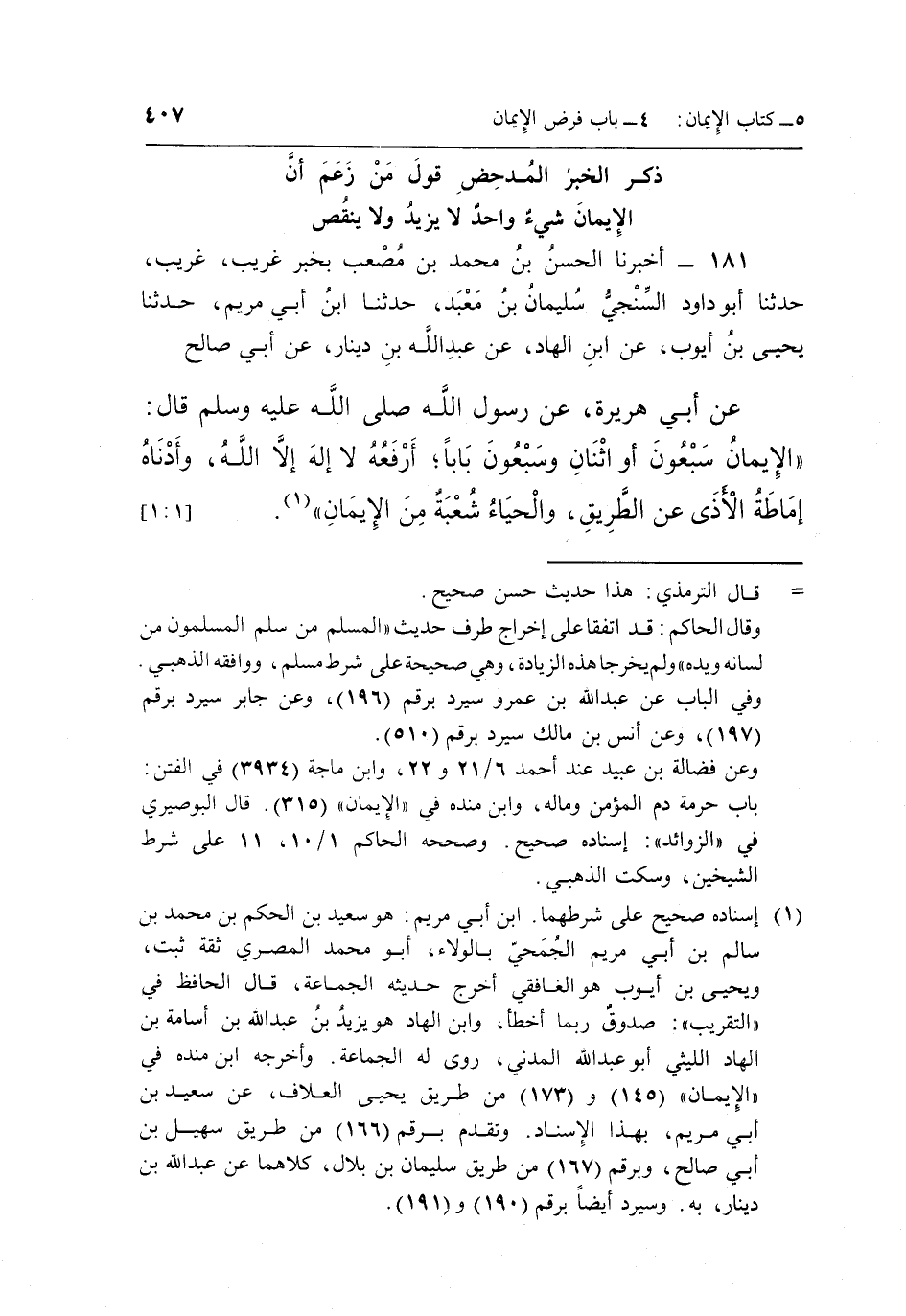 181 - أَخْبَرَنَا الْحُسَيْنُ بْنُ مُحَمَّدِ بْنِ مُصْعَبٍ بِخَبَرٍ غَرِيبٍ حَدَّثَنَا أَبُو دَاوُدَ السِّنْجِيُّ سُلَيْمَانُ بْنُ مَعْبَدٍ حدثنا بن أَبِي مَرْيَمَ حَدَّثَنَا يَحْيَى بْنُ أَيُّوبَ عَنِ بْنِ الْهَادِ عَنْ عَبْدِ اللَّهِ بْنِ دِينَارٍ عَنْ أَبِي صَالِحٍ عَنْ أَبِي هُرَيْرَةَ عَنْ رَسُولِ اللَّهِ صَلَّى اللَّهُ عَلَيْهِ وسلم قال: "الْإِيمَانُ سَبْعُونَ أَوِ اثْنَانِ وَسَبْعُونَ بَابًا أَرْفَعُهُ لَا إِلَهَ إِلَّا اللَّهُ وَأَدْنَاهُ إِمَاطَةُ الْأَذَى عن الطريق والحياء شعبة من الإيمان"1. [1:1]