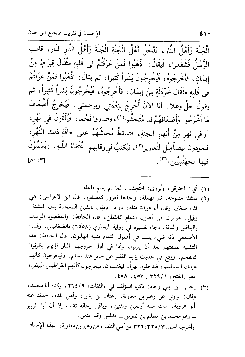 الْجَنَّةِ وَأَهْلُ النَّارِ يَدْخُلُ أَهْلُ الْجَنَّةِ الْجَنَّةَ وَأَهْلُ النَّارِ النَّارَ قَامَتِ الرُّسُلُ فَشَفَعُوا فَيُقَالُ اذْهَبُوا فَمَنْ عَرَفْتُمْ فِي قَلْبِهِ مِثْقَالَ قِيرَاطٍ مِنْ إِيمَانٍ فَأَخْرِجُوهُ فَيُخْرِجُونَ بَشَرًا كَثِيرًا ثُمَّ يُقَالُ اذْهَبُوا فَمَنْ عَرَفْتُمْ فِي قَلْبِهِ مِثْقَالَ خَرْدَلَةٍ مِنْ إِيمَانٍ فَأَخْرِجُوهُ فَيُخْرِجُونَ بَشَرًا كَثِيرًا ثُمَّ يَقُولُ جَلَّ وَعَلَا أَنَا الْآنَ أُخْرِجُ بِنِعْمَتِي وَبِرَحْمَتِي فَيُخْرِجُ أَضْعَافَ مَا أَخْرَجُوا وَأَضْعَافَهُمْ قَدِ امْتَحَشُوا1 وَصَارُوا فَحْمًا فَيُلْقَوْنَ فِي نَهْرٍ أَوْ فِي نَهْرٍ مِنْ أَنْهَارِ الْجَنَّةِ فَتَسْقُطُ مُحَاشُّهُمْ عَلَى حَافَةِ ذَلِكَ النَّهَرِ فَيَعُودُونَ بِيضًا مِثْلَ الثَّعَارِيرِ2 فَيُكْتَبُ فِي رِقَابِهِمْ عُتَقَاءُ اللَّهِ وَيُسَمَّوْنَ فِيهَا الْجَهَنَّمِيِّينَ"3. [80:3]