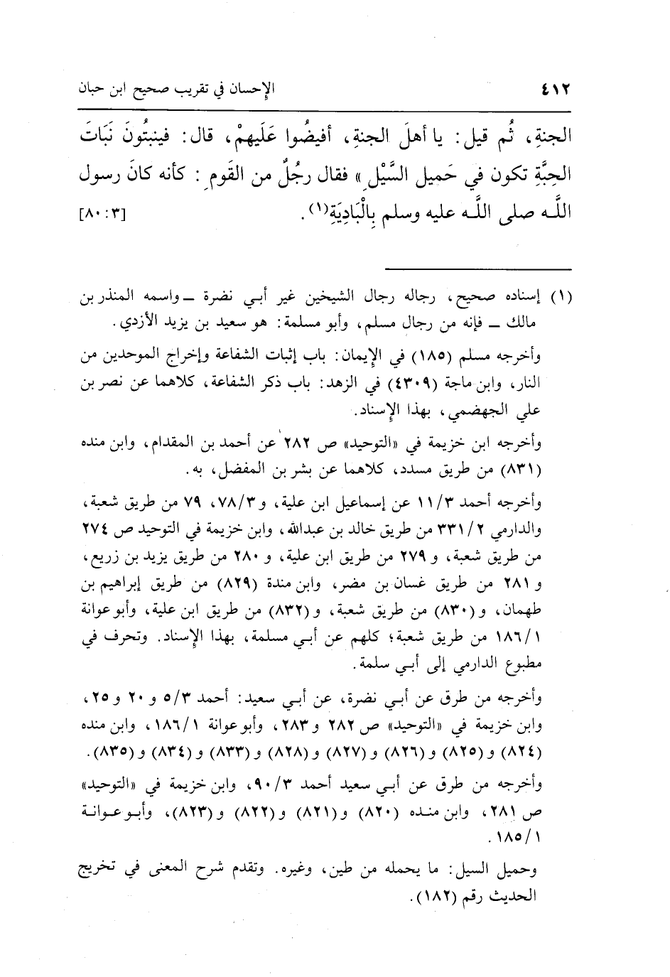 الْجَنَّةِ ثُمَّ قِيلَ يَا أَهْلَ الْجَنَّةِ أَفِيضُوا عَلَيْهِمْ قَالَ فَيَنْبُتُونَ نَبَاتَ الْحِبَّةِ تَكُونُ فِي حَمِيلِ السَّيْلِ" فَقَالَ رَجُلٌ مِنَ الْقَوْمِ: كَأَنَّهُ كَانَ رَسُولُ اللَّهِ صَلَّى اللَّهُ عَلَيْهِ وَسَلَّمَ بالبادية1. [80:3]
