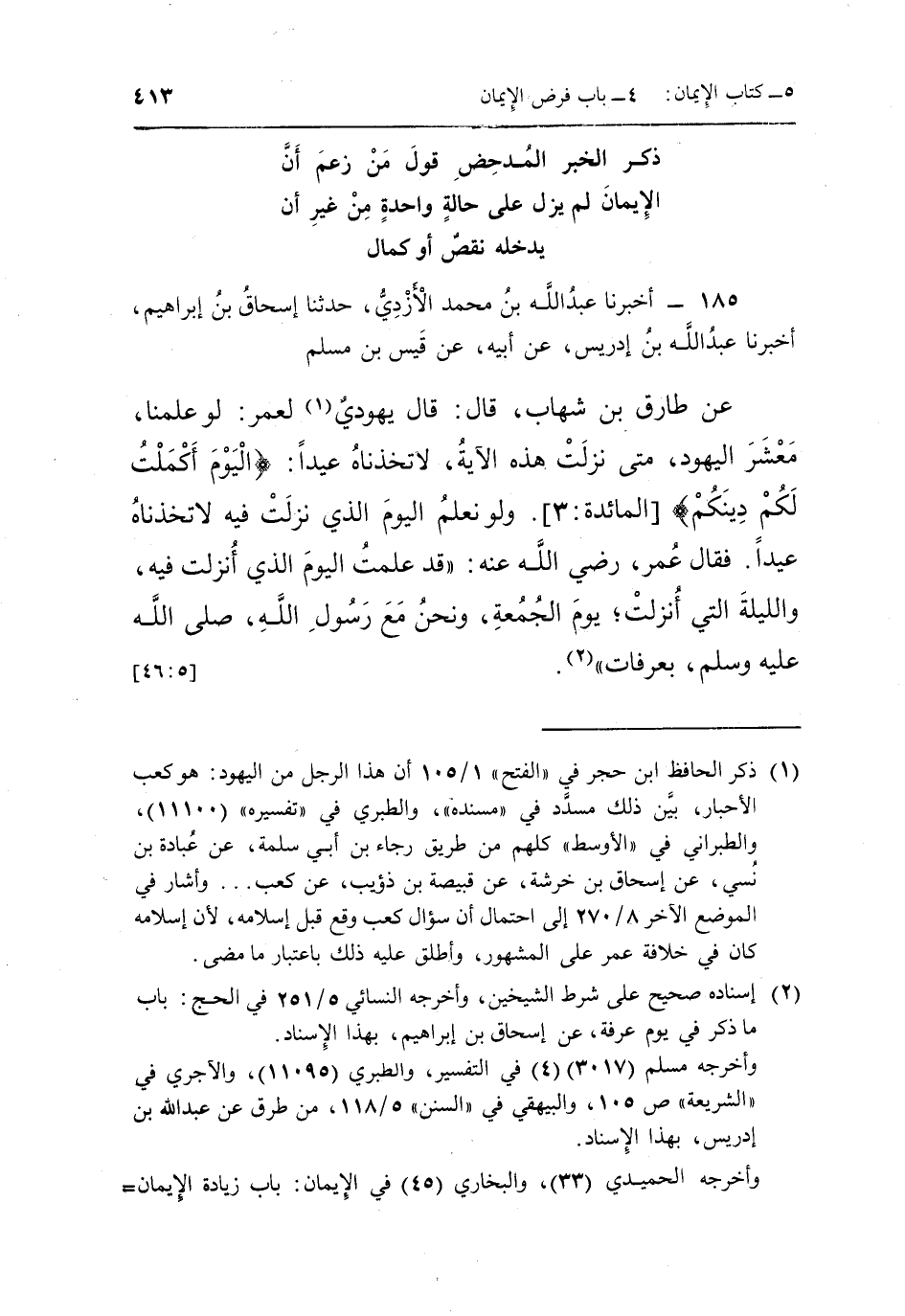 185 - أَخْبَرَنَا عَبْدُ اللَّهِ بْنُ مُحَمَّدٍ الْأَزْدِيُّ حَدَّثَنَا إِسْحَاقُ بْنُ إِبْرَاهِيمَ أَخْبَرَنَا عَبْدُ اللَّهِ بْنُ إِدْرِيسَ عَنْ أَبِيهِ عَنْ قَيْسِ بْنِ مُسْلِمٍ عَنْ طَارِقِ بْنِ شِهَابٍ قَالَ: قَالَ يَهُودِيٌّ1 لِعُمَرَ: لَوْ عَلِمْنَا مَعْشَرَ الْيَهُودِ مَتَى نَزَلَتْ هَذِهِ الْآيَةُ لَاتَّخَذْنَاهُ عِيدًا {الْيَوْمَ أَكْمَلْتُ لَكُمْ دِينَكُمْ} [المائدة: 3] وَلَوْ نَعْلَمُ الْيَوْمَ الَّذِي نَزَلَتْ فِيهِ لاتخذناه عيدا فقال عمر رضي الله تعالى عَنْهُ: "قَدْ عَلِمْتُ الْيَوْمَ الَّذِي أُنْزِلَتْ فِيهِ وَاللَّيْلَةَ الَّتِي أُنْزِلَتْ يَوْمَ الْجُمُعَةِ وَنَحْنُ مَعَ رَسُولِ اللَّهِ صَلَّى اللَّهُ عَلَيْهِ وَسَلَّمَ بِعَرَفَاتٍ"2. [46:5]
