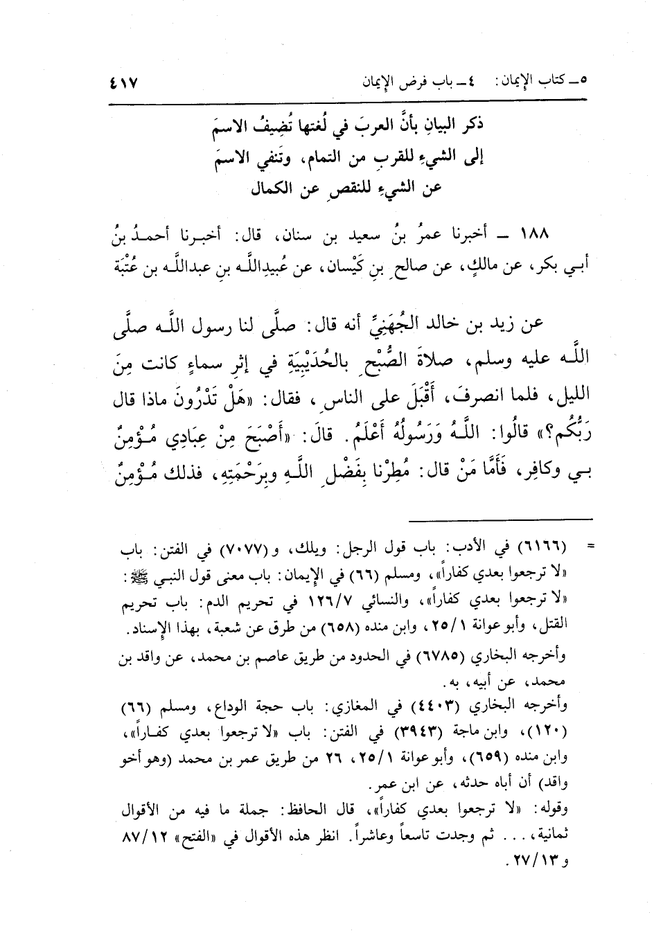 188 - أَخْبَرَنَا عُمَرُ بْنُ سَعِيدِ بْنِ سِنَانٍ قَالَ أَخْبَرَنَا أَحْمَدُ بْنُ أَبِي بَكْرٍ عَنْ مَالِكٍ عَنْ صَالِحِ بْنِ كَيْسَانَ عَنْ عُبَيْدِ اللَّهِ بْنِ عَبْدِ اللَّهِ بْنِ عُتْبَةَ عَنْ زَيْدِ بْنِ خَالِدٍ الْجُهَنِيِّ أَنَّهُ قَالَ صَلَّى لَنَا رَسُولُ اللَّهِ صَلَّى اللَّهُ عَلَيْهِ وَسَلَّمَ صَلَاةَ الصُّبْحِ بِالْحُدَيْبِيَةِ فِي إِثْرِ سَمَاءٍ كَانَتْ مِنَ اللَّيْلِ فَلَمَّا انْصَرَفَ أَقْبَلَ عَلَى النَّاسِ فَقَالَ: "هَلْ تَدْرُونَ مَاذَا قَالَ رَبُّكُمْ؟ " قَالُوا: اللَّهُ وَرَسُولُهُ أَعْلَمُ قَالَ: "أَصْبَحَ مِنْ عِبَادِي مُؤْمِنٌ بِي وَكَافِرٌ فَأَمَّا مَنْ قَالَ مُطِرْنَا بِفَضْلِ اللَّهِ وبرحمته فذلك مؤمنذكر الْبَيَانِ بِأَنَّ الْعَرَبَ فِي لُغَتِهَا تُضِيفُ الِاسْمَ إِلَى الشَّيْءِ لِلْقُرْبِ مِنَ التَّمَامِ وَتَنْفِي الِاسْمَ عَنِ الشَّيْءِ لِلنَّقْصِ عَنِ الْكَمَالِ