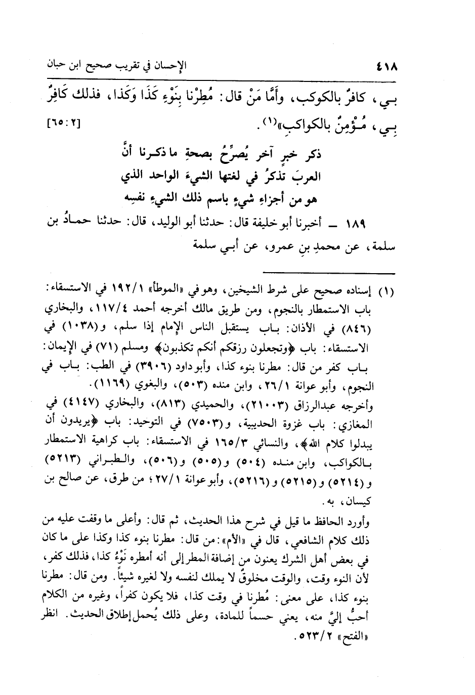 وأورد الحافظ ما قيل في شرح هذا الحديث ثم قال: وأعلى ما وقفت عليه من ذلك كلام الشافعي، قال في "الأم" من قال: مُطرنا بنوء كذا وكذا على ما كان بعض أهل الشرك يعنون من إضافة المطر إلى أنه مطر نَوْءُ كذا، فذلك كفر؛ لأن النوء وقت، والوقت مخلوق لا يملك لنفسه ولا لغيره شيئاً، ومن قال: مُطرنا بنوء كذا، على معنى: مُطرنا في وقت كذا، فلا يكون كفراً، وغيره من الكلام أحبُّ إليّ منه. يعني حسماً للمادة، وعلى ذلك يحمل إطلاق الحديث. انظر "الفتح" 2/523